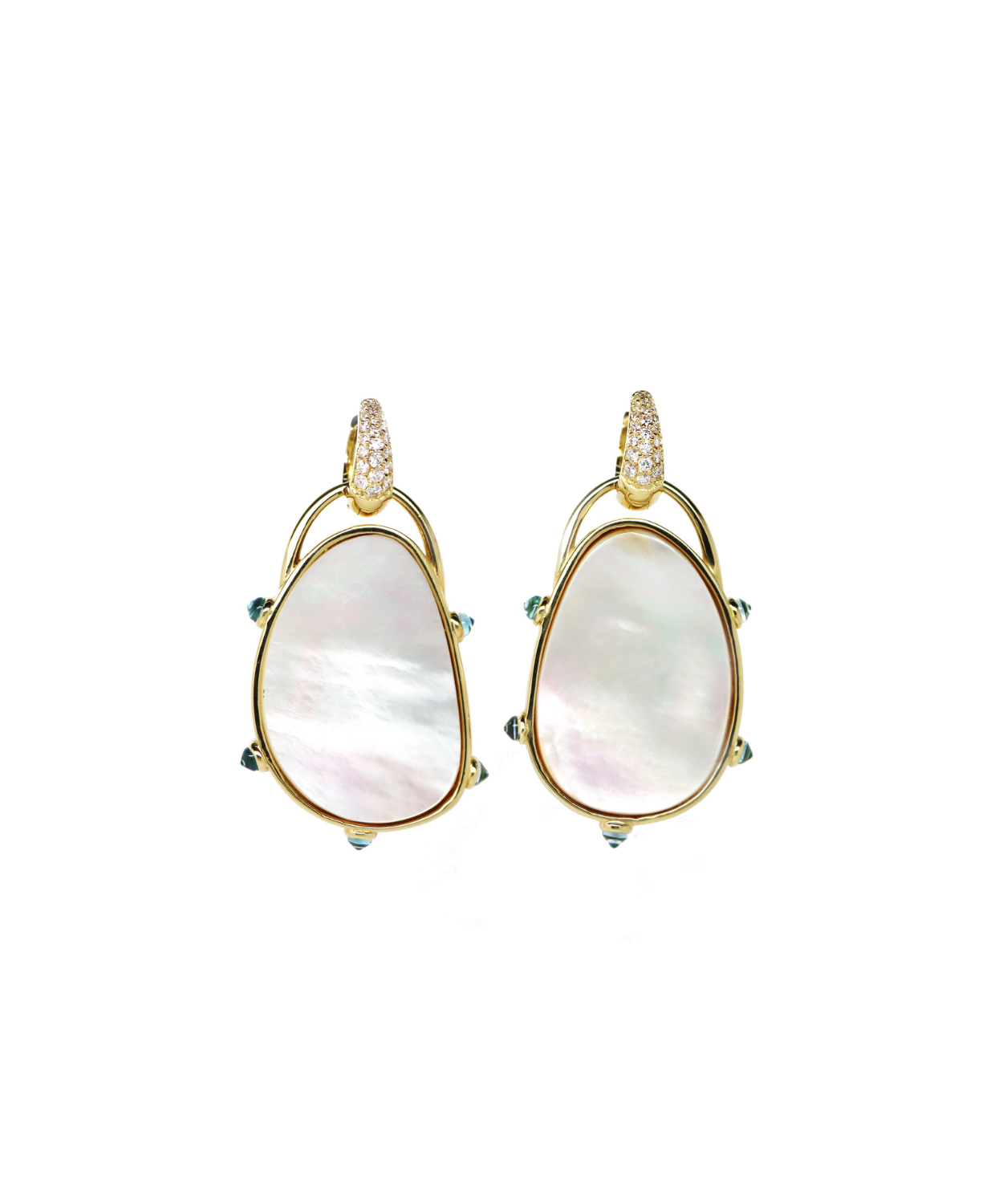 These beautiful natural Mother of Pearl earrings in 18k yellow gold and reverse diamond smooth cut natural blue topaz, are exclusive to their Privé Collection and are truly unique. The diamond hoops completely come off so that one can wear the earrings with the hoops or on their own. Furthermore, ... Read more the Mother of Pearl can be worn on either side (white Mother of Pearl and beige linear lines on the reveres side). There are only one pair of the large and one pair of the small earrings for complete exclusivity. Further earrings can be made to order and can be made in other coloured gemstones. Pre-Orders generally take 6-8 weeks and may take longer due to the global pandemic outbreak.