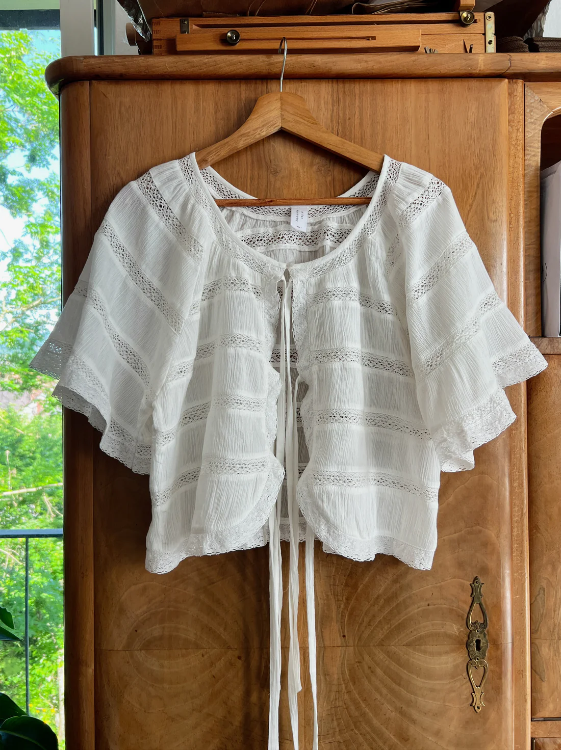 Crafted in super fine, crinkled cotton and adorned with laces running throughout the body, Noemi blouse add a burst of romance to warm summer days. The blouse features elbow length voluminous raglan sleeves and front ties. ... Read more