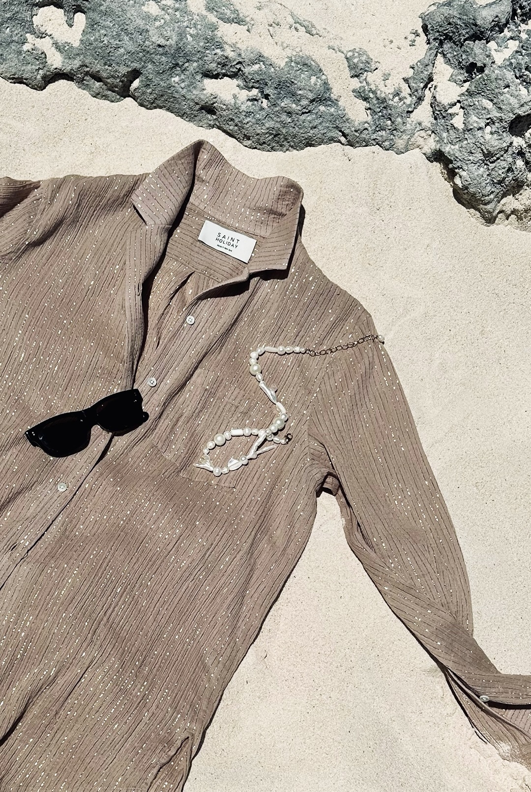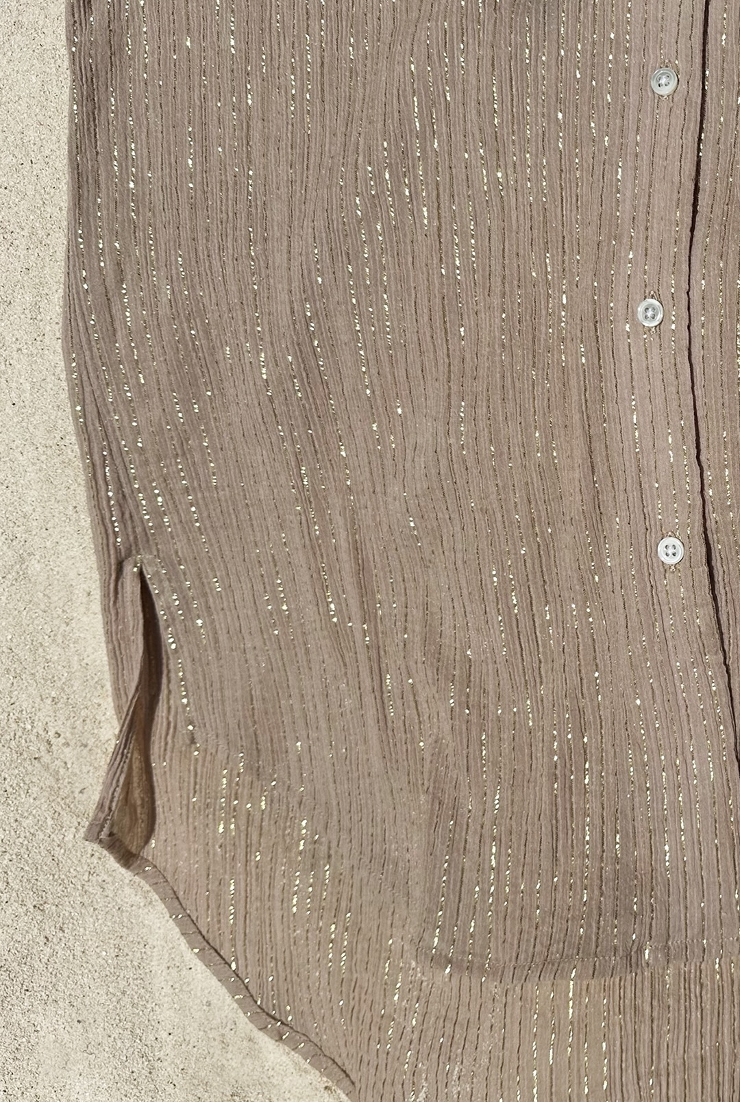 A shimmering beach shirt crafted from custom-dyed premium Japanese cotton, woven with a delicate lurex stripe. The fabric’s unique texture resists wrinkling in your suitcase, while the subtly sheer finish and extra-long cut create an elegant, easy silhouette. Finished with a slim notched collar and ... Read more mother-of-pearl buttons, it’s a luxe cover-up in a warm sandy hue. Pair it with the Islander sarong for a chic, coordinated set.