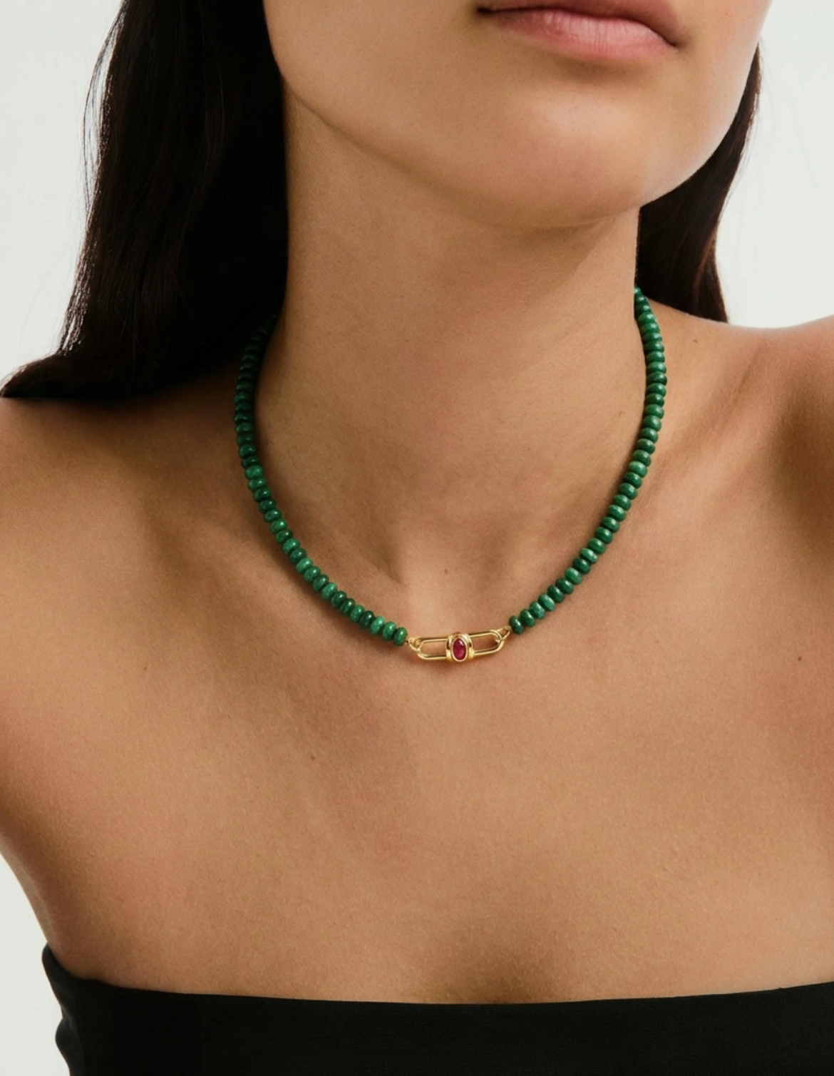 Kimjoux have returned to the Roaring Twenties with the Poize collection, taking inspiration from Art Deco architecture and elegant arched shapes. Featuring a Natural Pink Tourmaline Cabochon "Moving Arch" lock mechanism keeps everything perfectly in place and perfectly balanced. Express your fun ... Read more side with the mesmerising colour of Malachite beads. Length: 16-17 Inches