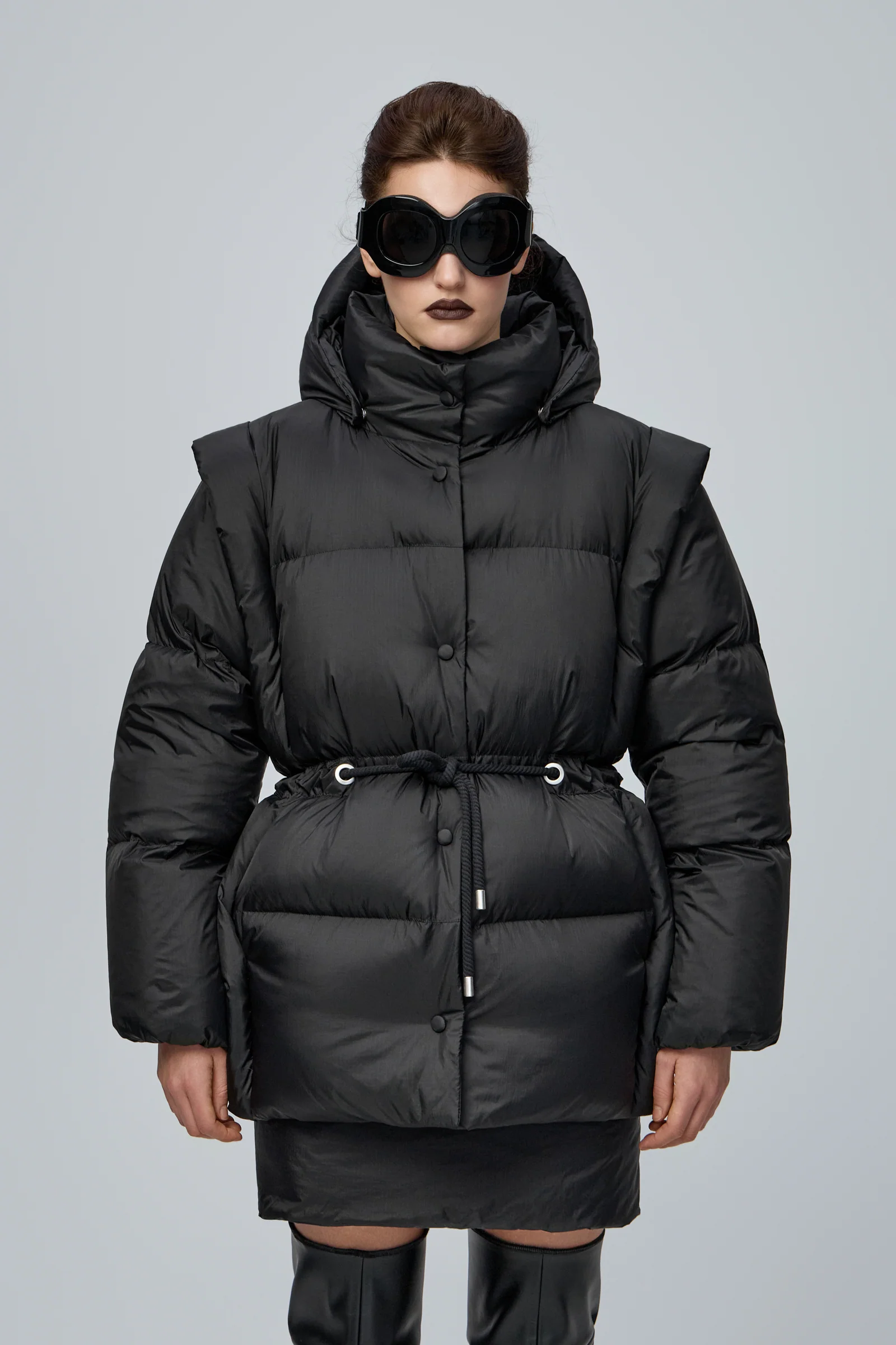Stay warm in elevated style with this sculpted black puffer vest jacket, designed with a high protective hood, structured shoulders, and a cinched drawstring waist that shapes the silhouette effortlessly. The smooth, matte finish and clean snap-button closure add a refined edge, while the plush ... Read more padding ensures maximum comfort in colder weather. A perfect blend of function and fashion, this statement puffer brings modern sophistication to everyday winter dressing.