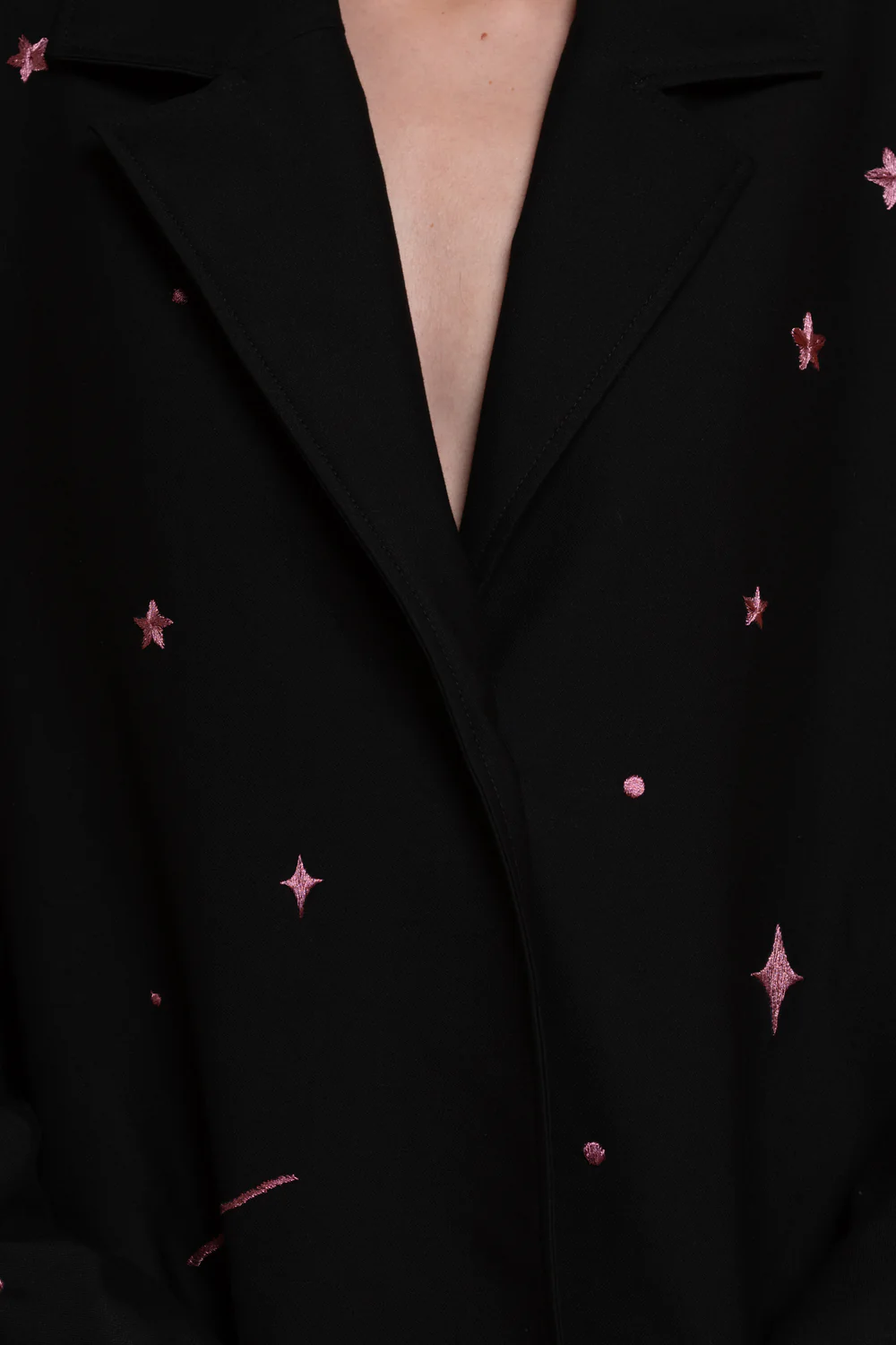 The Rabbit blazer is a striking fusion of refined tailoring and playful artistry. Its sleek silhouette, defined by a slim peak lapel and crisp lines, is elevated by hand-embroidered pink metallic motifs that dance across the black canvas, turning classic structure into a statement of personality. ... Read more The blazer flows with effortless elegance, balancing boldness and subtle whimsy, making it a piece that transforms any outfit into an expression of confident, contemporary style.