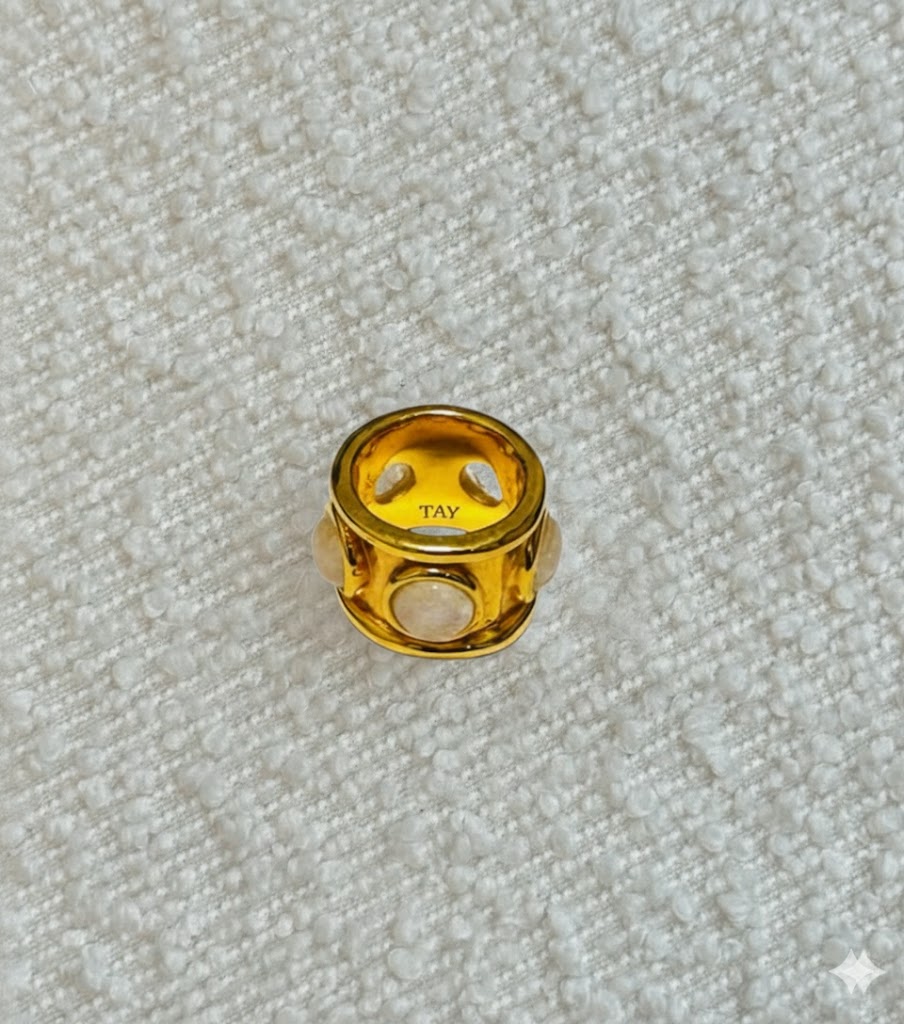 Large semi-precious stones are used to hand-craft the Tay jewelry collection, which is produced by talented craftsmen whose imaginations are unconstrained by contemporary trends. The design duo chooses each stone that is set by hand in gold-plated sterling silver or gold-plated brass settings. Prehnite, Malachite, Aquamarine, and Labradorite are just a few of the unique gems created in exotic Sri Lankan and Thai workshops. They are placed in a mix of traditional and contemporary settings.