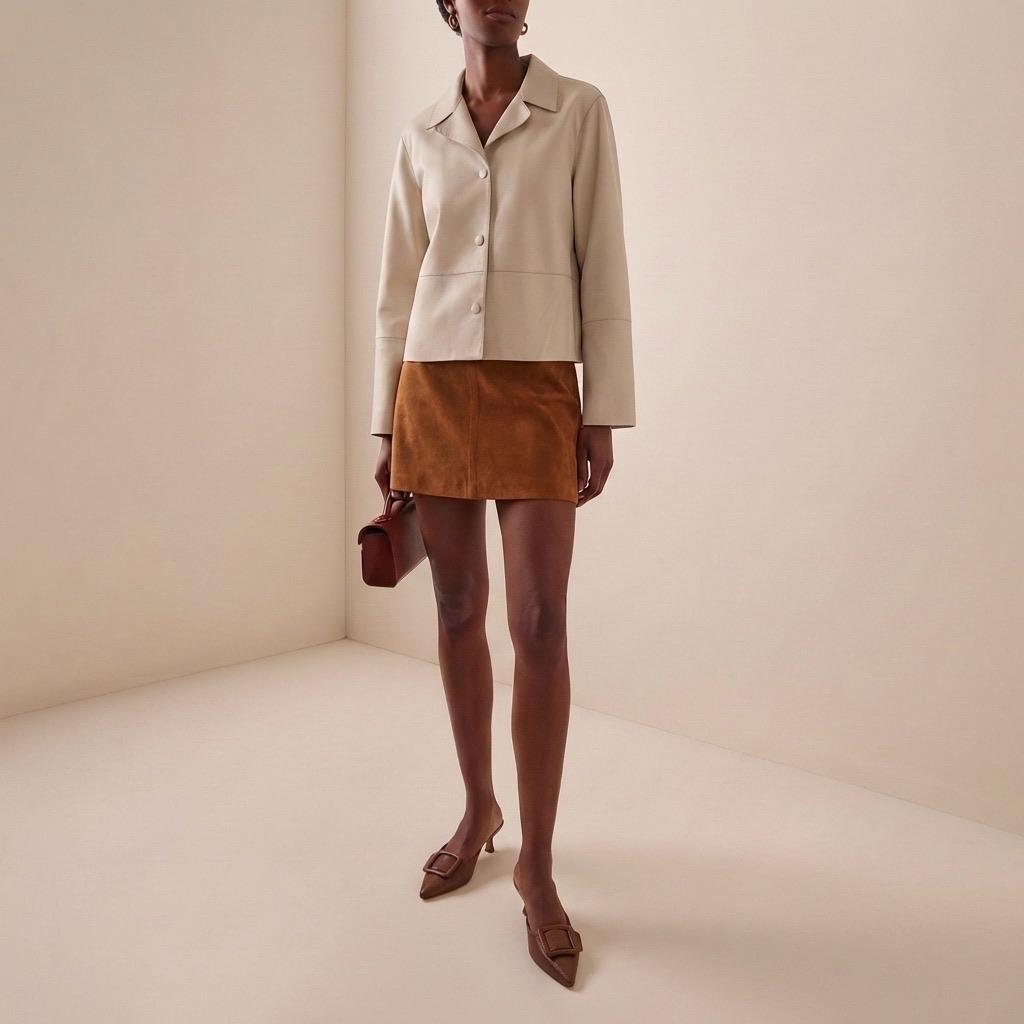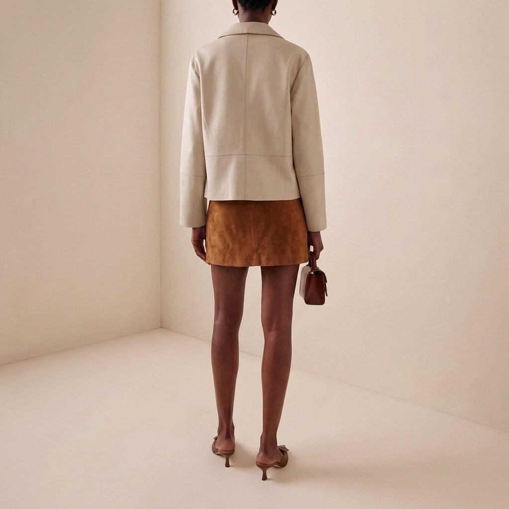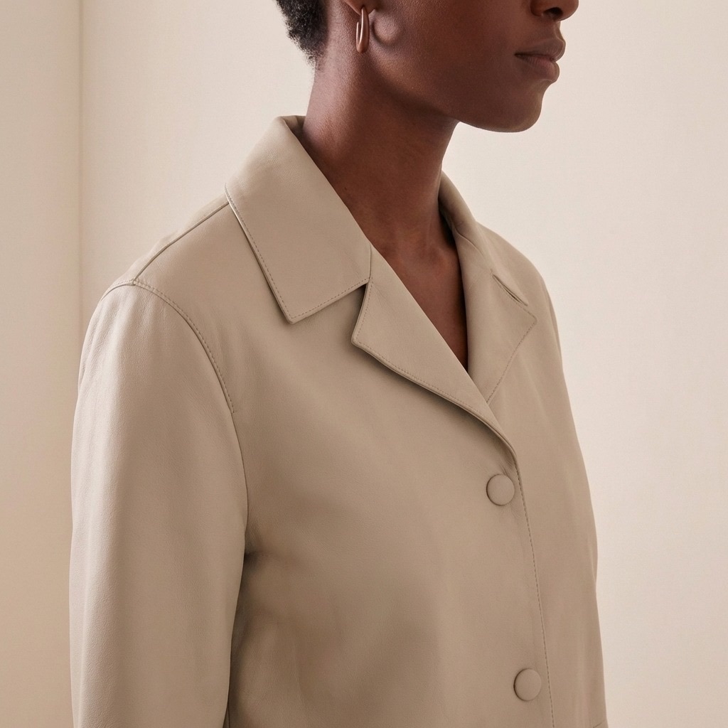 The Ralia Jacket is a contemporary essential, expertly crafted from smooth natural nappa leather in a beige. It features a clean, cropped silhouette, a classic pointed collar, and tonal snap-button closures for a seamless, minimalist finish. An effortlessly elevated layer designed for the modern ... Read more wardrobe.