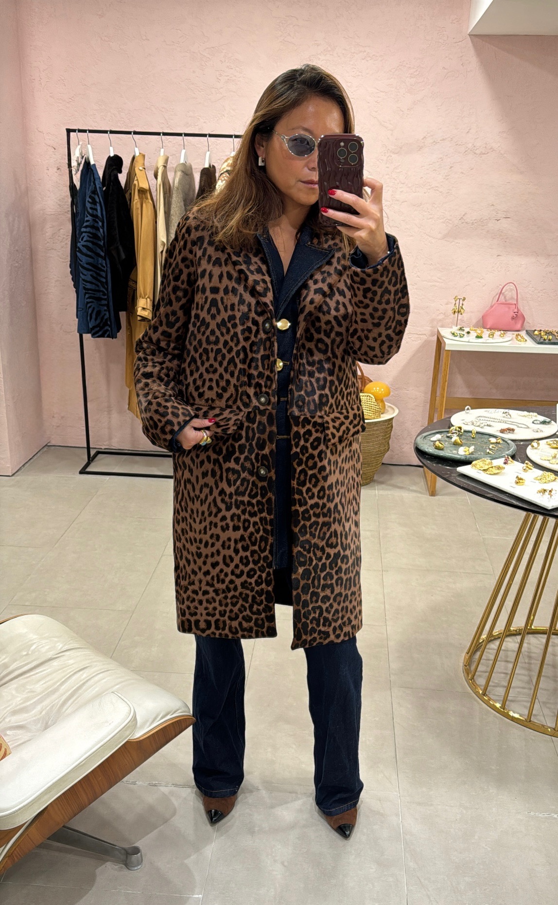 The Resonance Shearling Coat is a bold yet timeless outerwear piece that instantly elevates any cold-weather look. Crafted from plush 100% shearling in a striking leopard print, it offers a relaxed mid-length silhouette that’s both chic and practical. The structured collar, button fastening, and ... Read more side pockets make it functional without compromising on style. Perfect for day-to-night dressing, this coat pairs effortlessly with sleek black tailoring for a polished city look, or draped over a casual knit and denim for effortless off-duty chic. For evenings, wear it over a slip dress with heeled boots to add a touch of drama. Versatile, warm, and statement-making, the Resonance Shearling Coat is the ultimate cold-weather essential.