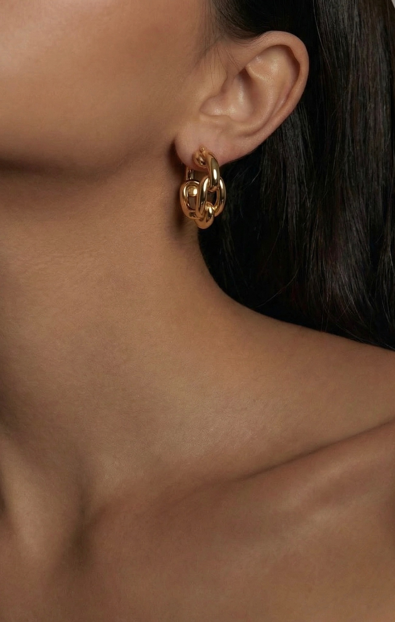The Rory earrings have a bold, gold-toned design featuring a chunky interlocking link pattern. It has a smooth, polished surface, giving it a shiny, luxurious finish. The links are thick and rounded, resembling a modern interpretation of a chain, likely giving the earrings a statement-making look. ... Read more