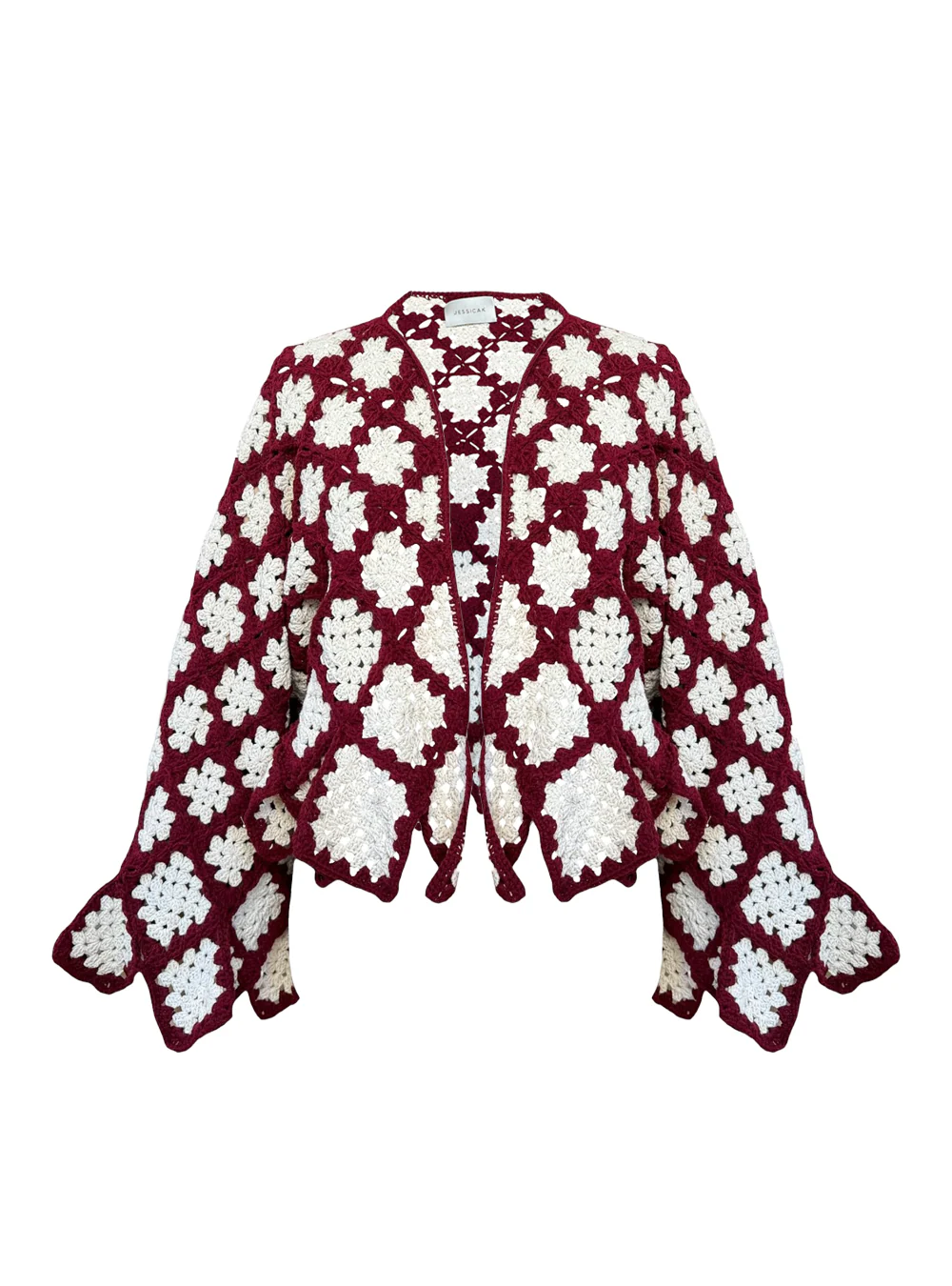 The Rose Cardigan is a handmade garment made entirely of 100% cotton. It features a distinct crocheted design in a rich burgundy and cream color scheme. The cardigan is composed of square patterns, each containing a floral or star-like motif, alternating between the two colors. The edges of the ... Read more cardigan have a scalloped finish, adding a delicate touch to its overall appearance. The design is reminiscent of vintage crochet styles, with the squares connected seamlessly to create a cohesive look. The sleeves are slightly flared, contributing to the garment's relaxed and bohemian aesthetic. The cardigan is open at the front, with no visible buttons or closures, making it ideal for layering. Overall, this cardigan has a warm and cozy appeal, perfect for casual wear during cooler seasons. Its handcrafted nature and intricate pattern make it a unique and eye-catching piece.