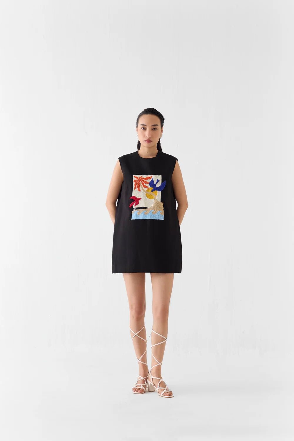 The Sahara Night Short Dress crafted from our stunning linen fabrication, trans-seasonal, is a statement piece. This short dress is tailored in a Straight, shift dress silhouette and is fully lined for comfort. Featuring a central back concealed zipper for a seamless finish, the piece is elevated ... Read more with delicate bead hemming. Intricately detailed with a hand embroidered scenic landscape of the night view of Sahara Dessert in sequins, the dress reflects fine artisanal craftsmanship. It has side pockets. Wear it with strappy heels for an elegant look. The model is wearing a Size S.