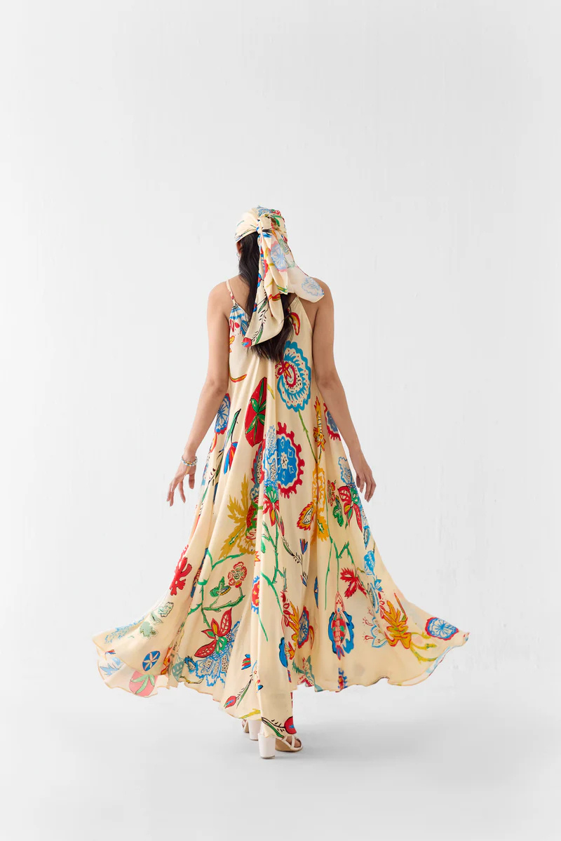 The Sanganer strappy dress crafted from our stunning vegan silk fabrication, trans-seasonal, is a statement piece. This dress, printed in our sanganer print inspired by the sanganeri block print motifs resembling suzani flowers, has a relaxed fit with straps. Featuring a summery look, it is A-line ... Read more and the straps are adjustable. Wear it with heels for an elegant look. Details: The model is wearing a Size S.