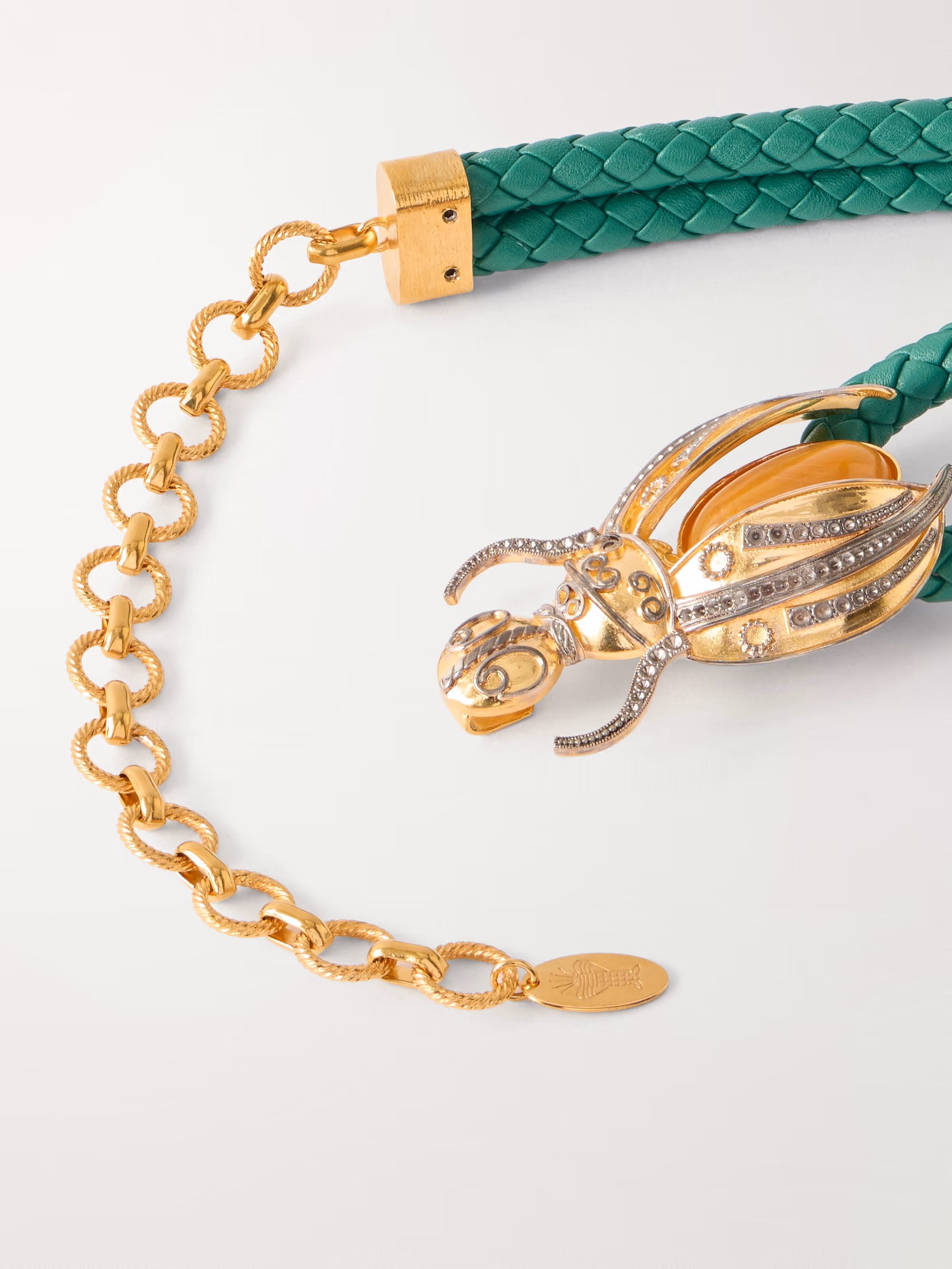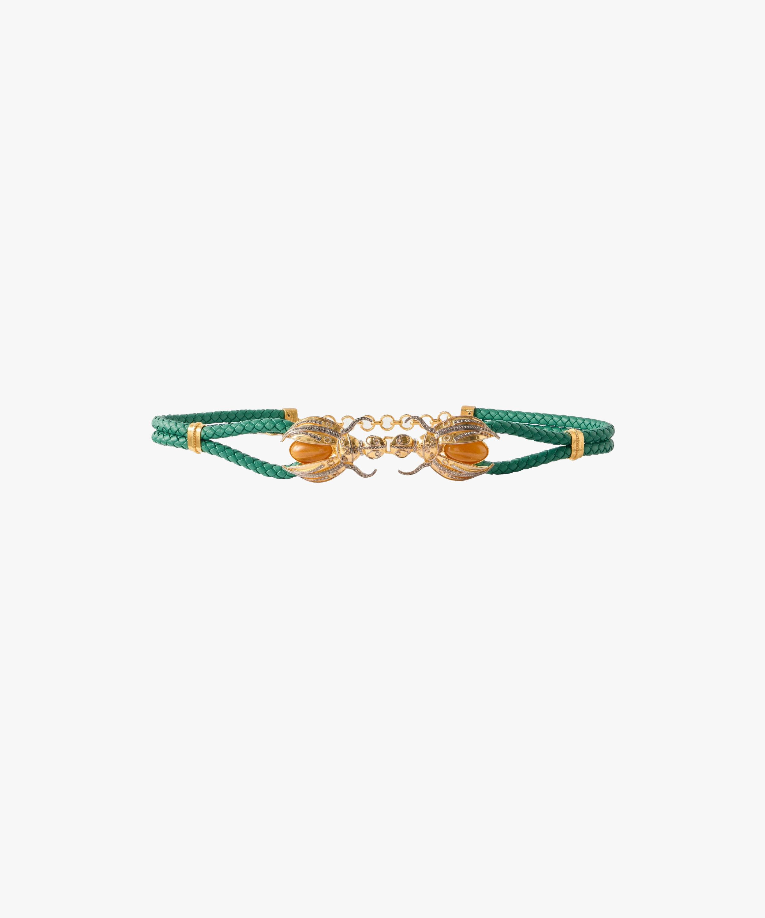 Sonia Petroff draws on ancient symbolism with the 'Scarab' belt. Crafted from braided leather, it’s centred by gold-plated beetle motifs set with amber-toned resin cabochons and Swarovski crystals, bringing texture and contrast to the design. ... Read more