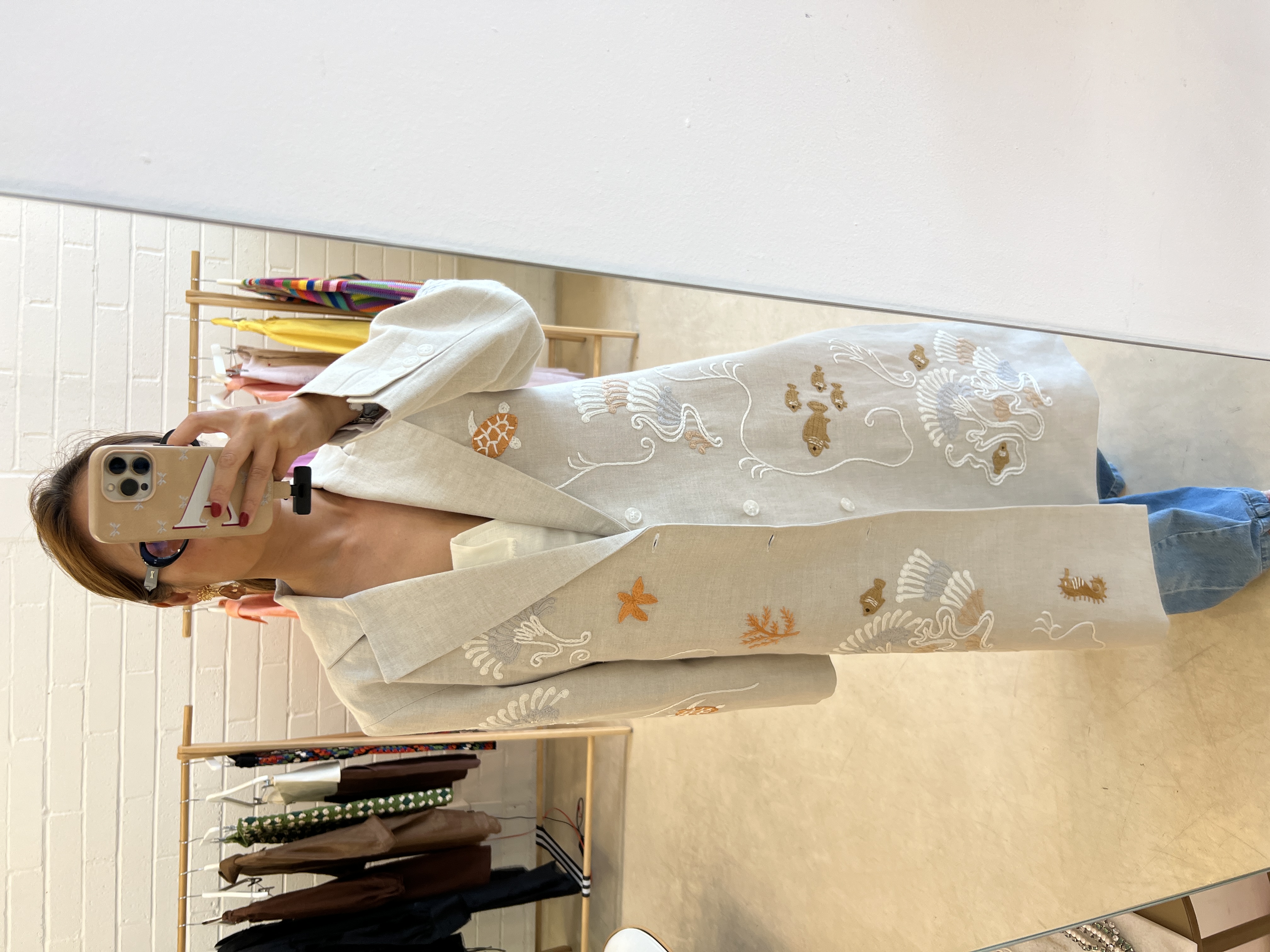 Introducing the Seashell Coat Linen from Artwear Gallery, a stunning piece that combines artistry with sophistication. Crafted from high-quality beige linen, this coat is both lightweight and luxurious, perfect for adding a touch of elegance to your wardrobe. The Seashell Coat Linen features ... Read more exquisite hand-embroidered seashells and sea life, meticulously stitched to create a captivating and unique design. Each detail is thoughtfully crafted, bringing the beauty of the ocean to life on this stunning garment.