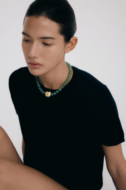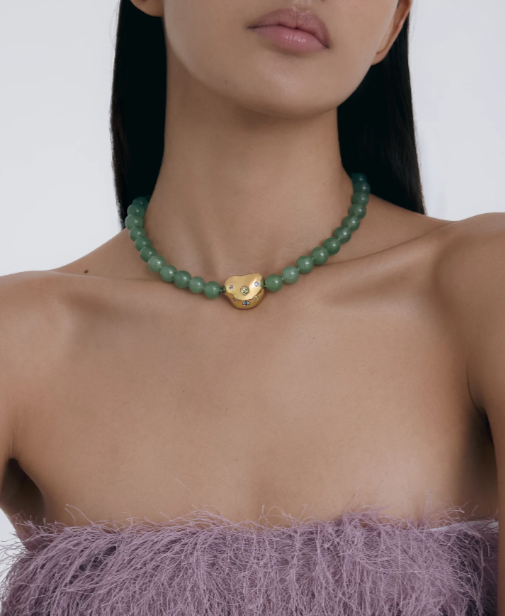 The Seed Aventurine necklace sits at the collarbone, designed to feel natural with any outfit, from day to evening. Soft, smooth green Aventurine beads bring a subtle sense of playfulness and colourful charm, punctuated by BOULO's signature organic gold accent - set with delicate touches of colour ... Read more that catch the eye without demanding attention. Finished with BOULO original t-lock closure, the necklaces balances function with vibrant, playful design, allowing the piece remain fluid and easy to wear. A colourful fine jewellery essential that feels light, expressive, and quietly distinctive.