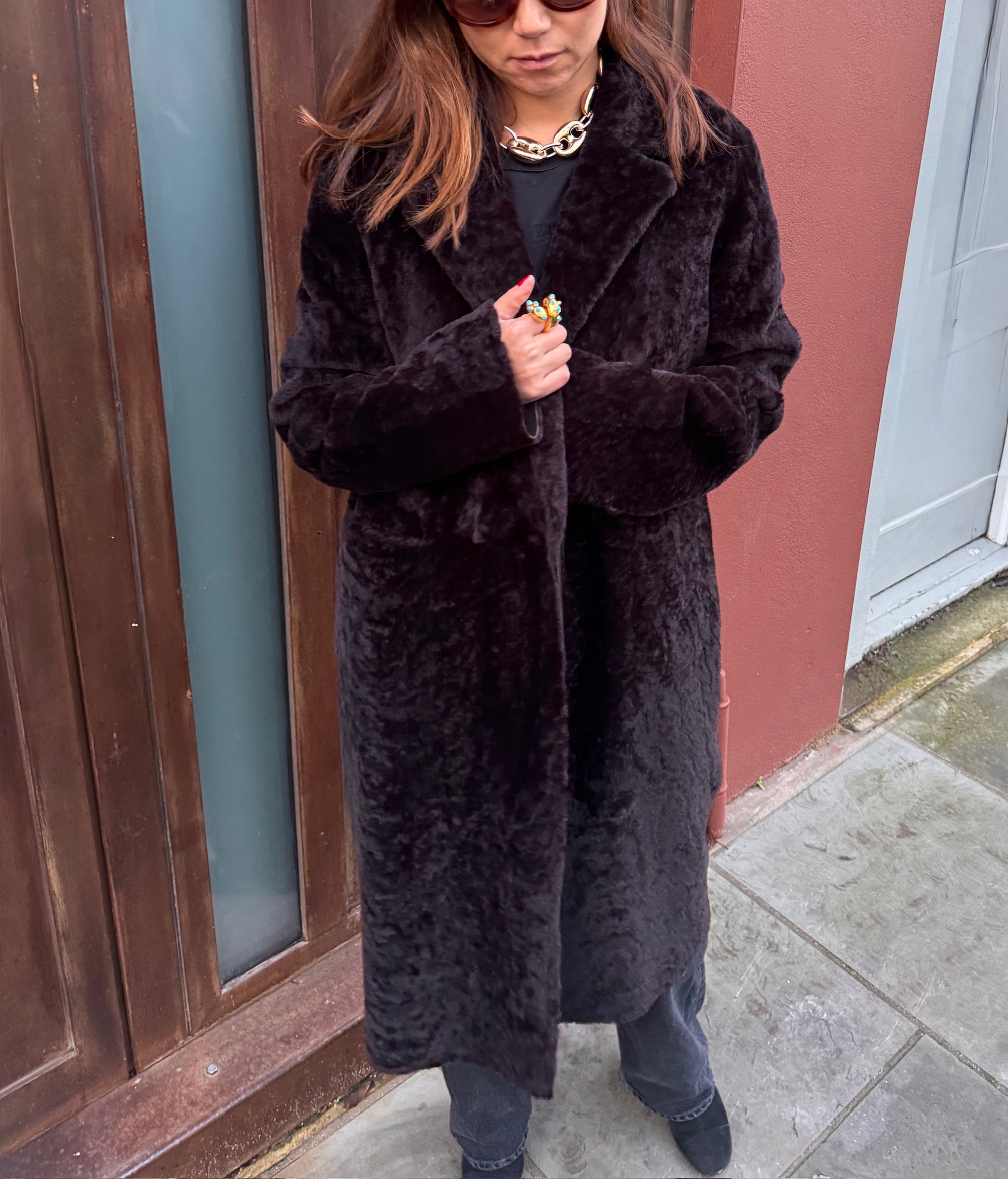 The Serenade Shearling Reversible Coat in Dark Brown is the perfect blend of cozy comfort and effortless sophistication. Designed in a 100% shearling with a relaxed, oversized fit, it drapes beautifully over any outfit while keeping you warm through the colder months. Its soft brown tone makes it ... Read more endlessly versatile, pairing seamlessly with both casual and elevated looks. For an easy everyday style, layer it over a crisp white tee and wide-leg trousers, or dress it up with tailored denim and sleek ankle boots. On extra-chilly days, throw it over a knit dress with knee-high boots for a chic layered look. However you style it, this coat brings a touch of understated luxury to your wardrobe.