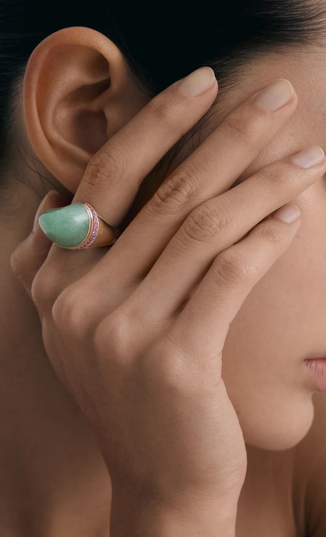 A bold interpretation of BOULO’s signature design, this ring features a hand-carved Aventurine as its focal point. Subtly framed by delicate stones, the composition enhances the depth and smooth texture of the carved surface without overpowering it. Designed for those drawn to sculptural rings, ... Read more Shapeless stone offers volume with everyday comfort. The result is a distinctive piece of colourful fine jewellery - rooted in craftsmanship, rich in character, and defined by an effortless sense of individuality. Please allow 6-8 weeks for made-to-order pieces.