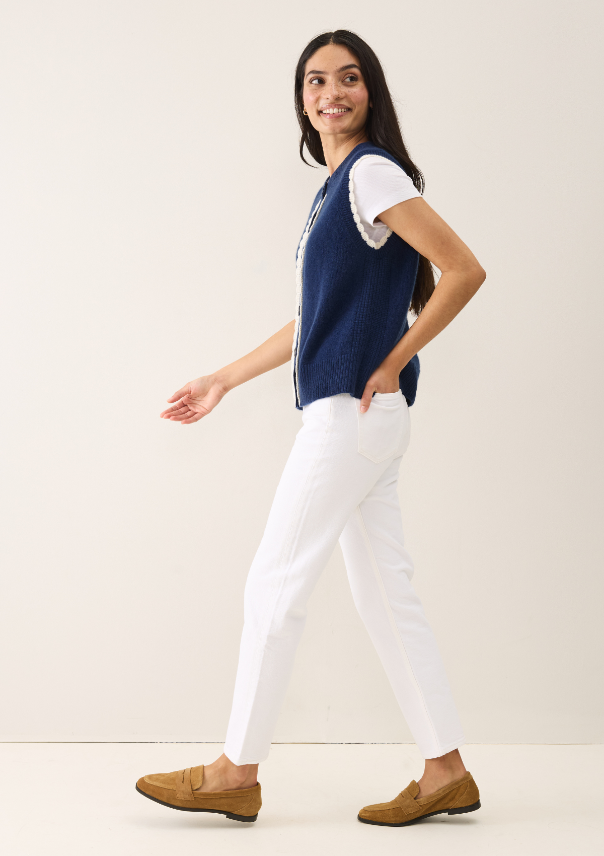 Defined by its delicate shell-edge trim, this waistcoat is designed as the perfect layering piece. Made from super-soft, 100% Inner Mongolian cashmere, it’s a versatile, season-spanning essential for your spring/summer wardrobe. Layer it early in the season, or wear it on its own as the weather ... Read more warms. It pairs beautifully with wide-leg linen trousers for summer occasions.