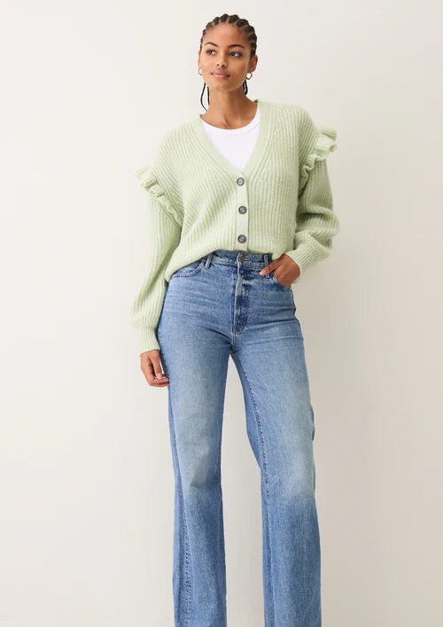 Introducing the Silk & Cashmere Frilled Cardigan in Tannin Green — a delicate, airy knit that blends the luxurious softness of cashmere with the subtle sheen of silk. Rendered in a fresh, uplifting tannin-mint green, this cardigan features playful frill detailing for a feminine touch, while its ... Read more lightweight 3 gauge construction ensures a graceful drape and breathable warmth. Perfect for layering over T-shirts or silk cami’s, it brings effortless elegance to relaxed weekends or slow evenings at home