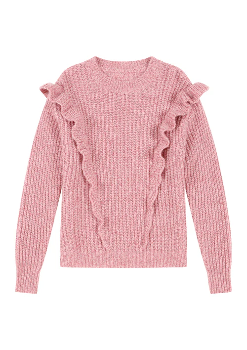 Add a touch of playful femininity to your winter wardrobe with this beautifully textured pink ruffle knit sweater. Crafted from a soft, cosy yarn blend, it features delicate ruffle detailing cascading down the front and shoulders for a charming, elevated silhouette. The classic crew neckline and ... Read more relaxed fit make it an effortless everyday piece, perfect for styling with denim, tailored trousers, or a sleek skirt. Warm, stylish, and subtly statement-making, it’s the ideal knit for brightening colder days.