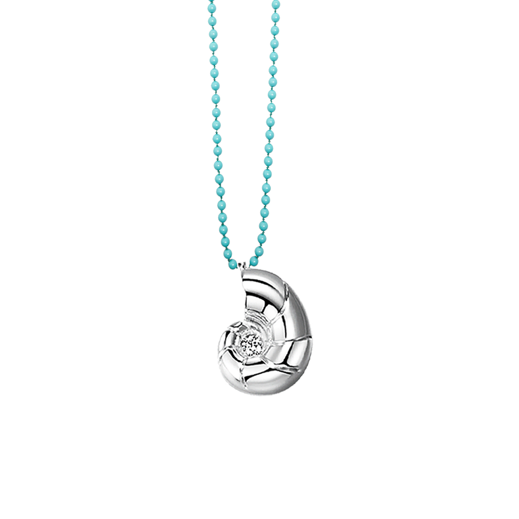 The Snail pendant is a polished silver piece shaped like a stylised nautilus shell, exuding elegance and organic charm. Its smooth, curved design is accentuated by a central sparkling gemstone, adding a touch of brilliance.The pendant is suspended from a delicate string of turquoise beads, adding a ... Read more vibrant pop of color and a touch of sophistication. Perfect for layering or wearing as a statement piece, this necklace brings a refined yet contemporary edge to any look.