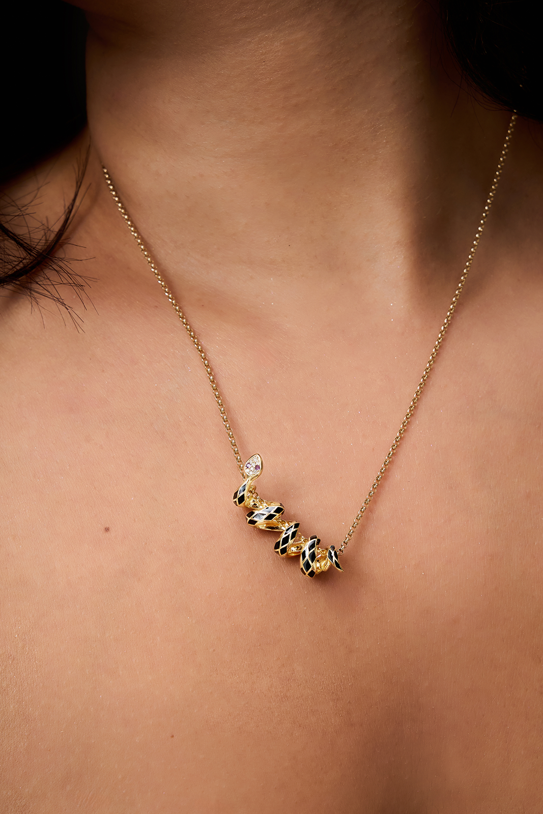 This sculptural piece wraps gracefully around the chain, its form fluid and bold, like a quiet whisper of strength. In Indian mythology, the serpent holds deep symbolic meaning; it adorns Lord Shiva’s neck as a mark of control over fear and death, forms the divine couch of Lord Vishnu as Sheshnag, ... Read more the coiled force believed to lie dormant at the base of the spine, waiting to rise.