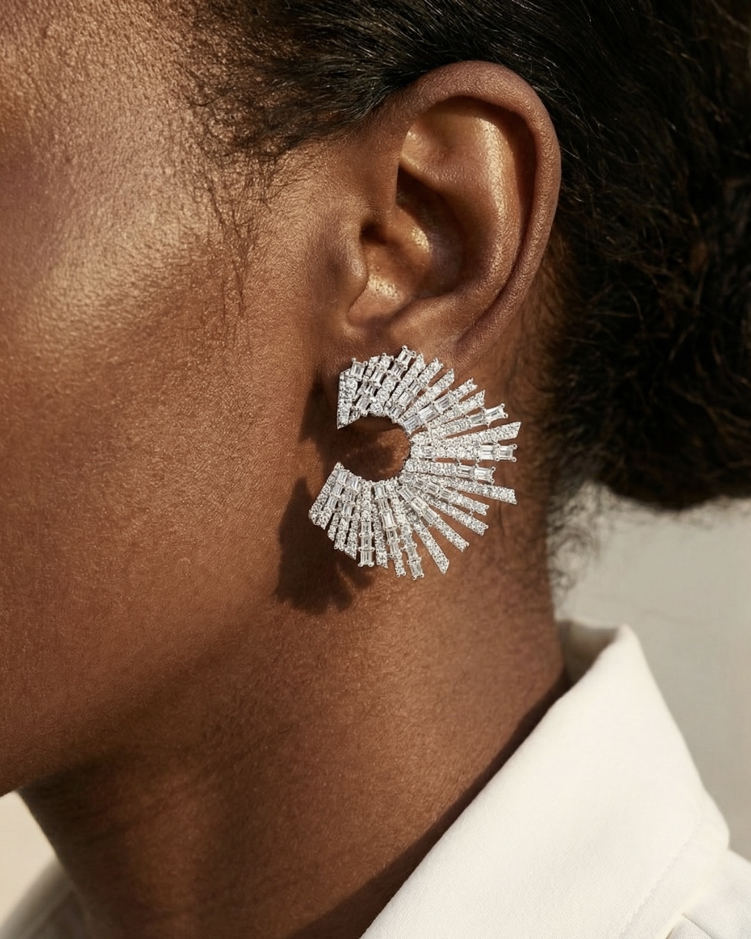 Radiating modern elegance, these statement earrings feature a stunning mix of baguette and round-cut stones arranged in a radiant sunburst design. Set on a silver base, they shimmer beautifully with every movement. To be worn both at night and during the day they are the perfect piece to always ... Read more carry with you in order to enhance any look.