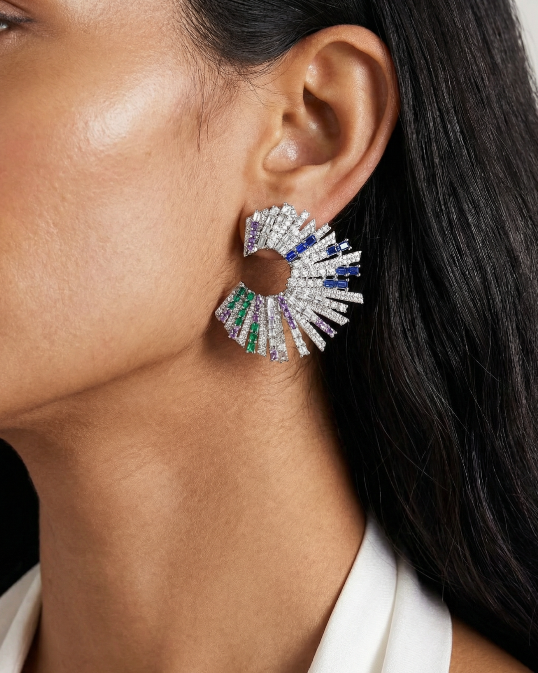 Starburst design, featuring varied stone sizes, cuts and colours that catch the light beautifully, inspired by celestial journeys and perfect for day or evening wear. ... Read more