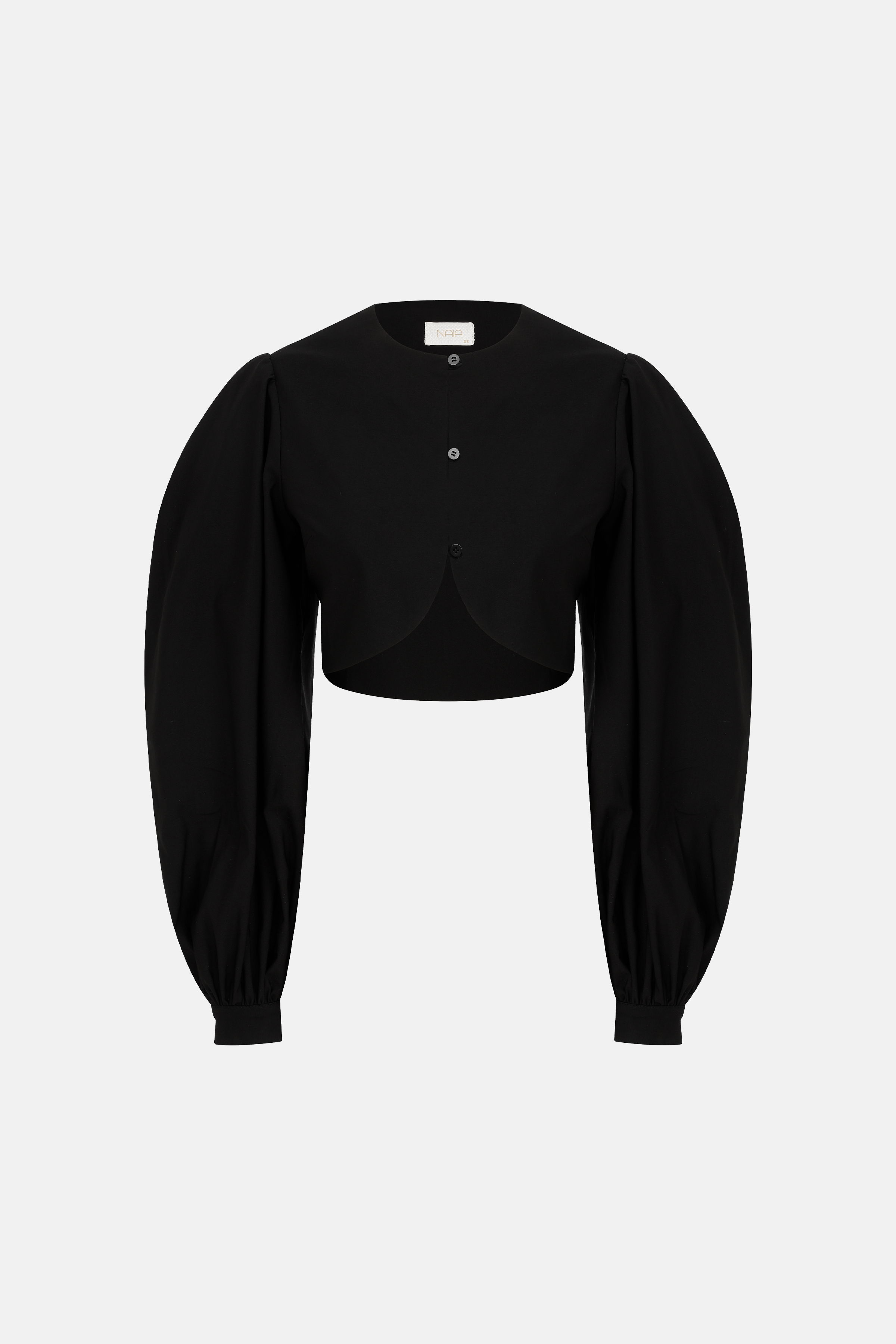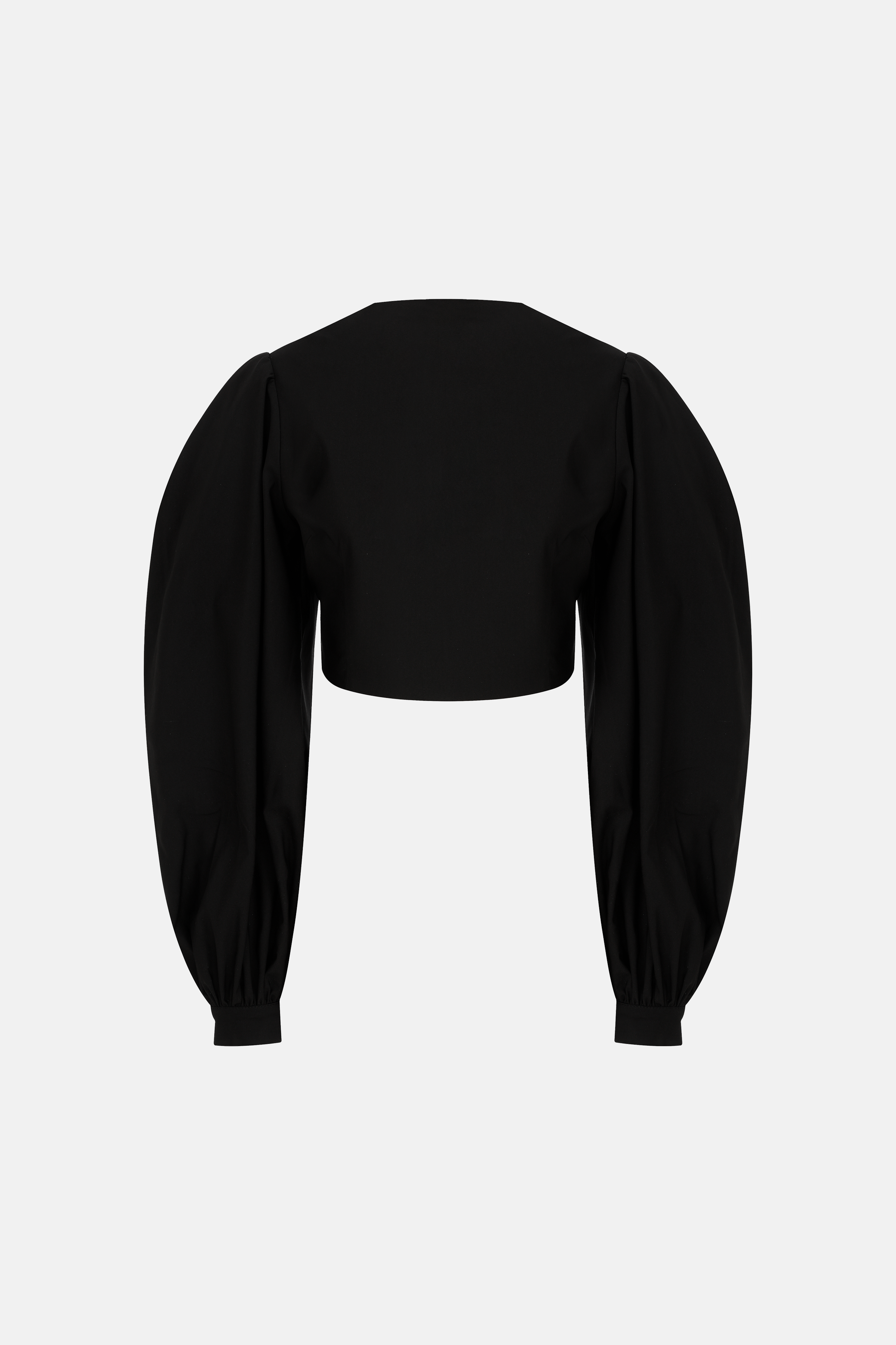 The Kiki Balloon-Sleeved Shirt / Black is a refined short style top cropped at the waist, featuring a round neckline and dramatic balloon sleeves that elevate everyday tailoring. Crafted in a fabric blend of 56% cotton, 33% polyester and 3% elastane, it offers comfort with just the right structure. ... Read more With its clean black tone and standout silhouette, this piece transitions effortlessly from office to evening - style it with high-waisted trousers for polished elegance or a mini-skirt and boots for bold attitude.