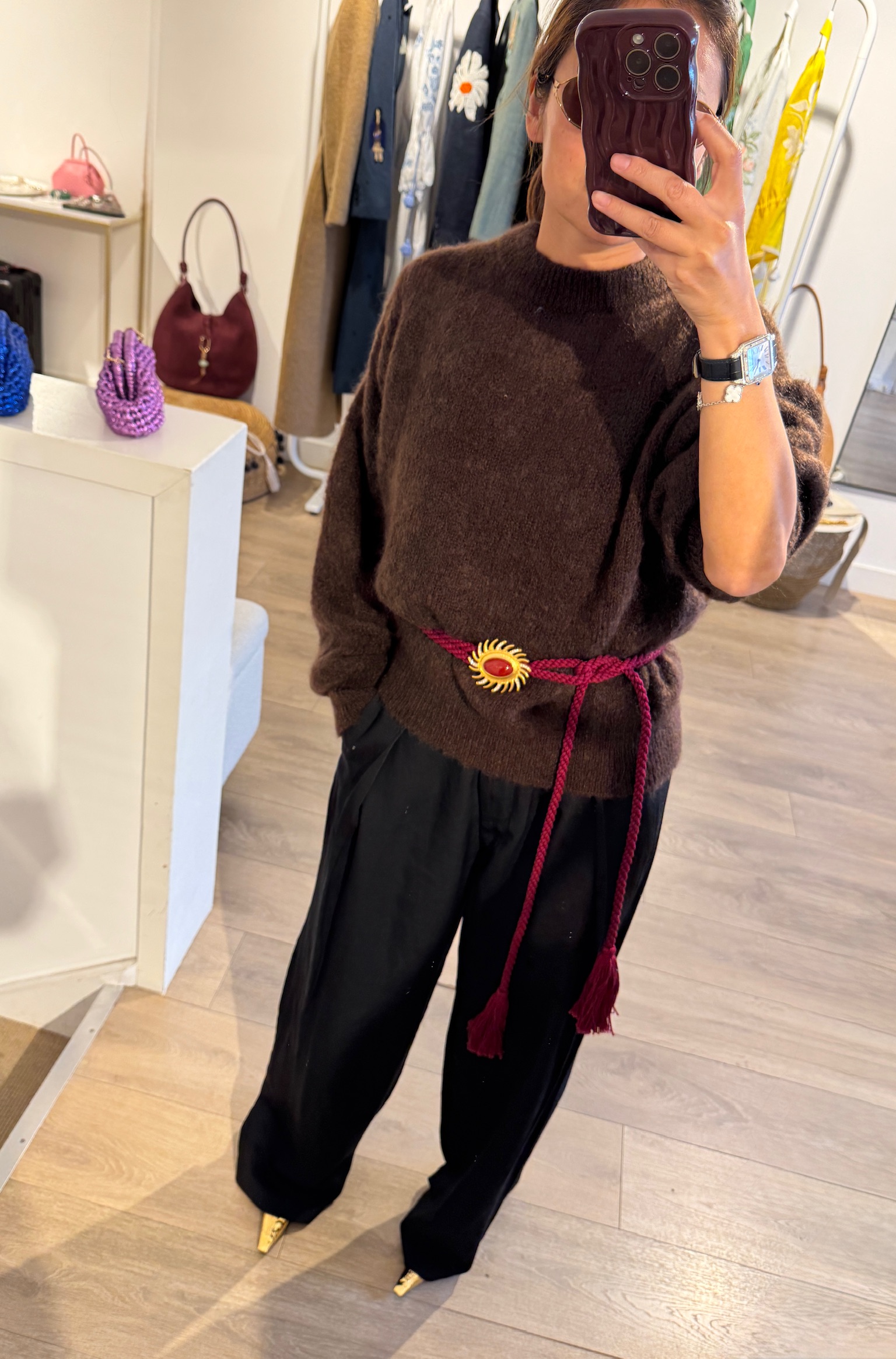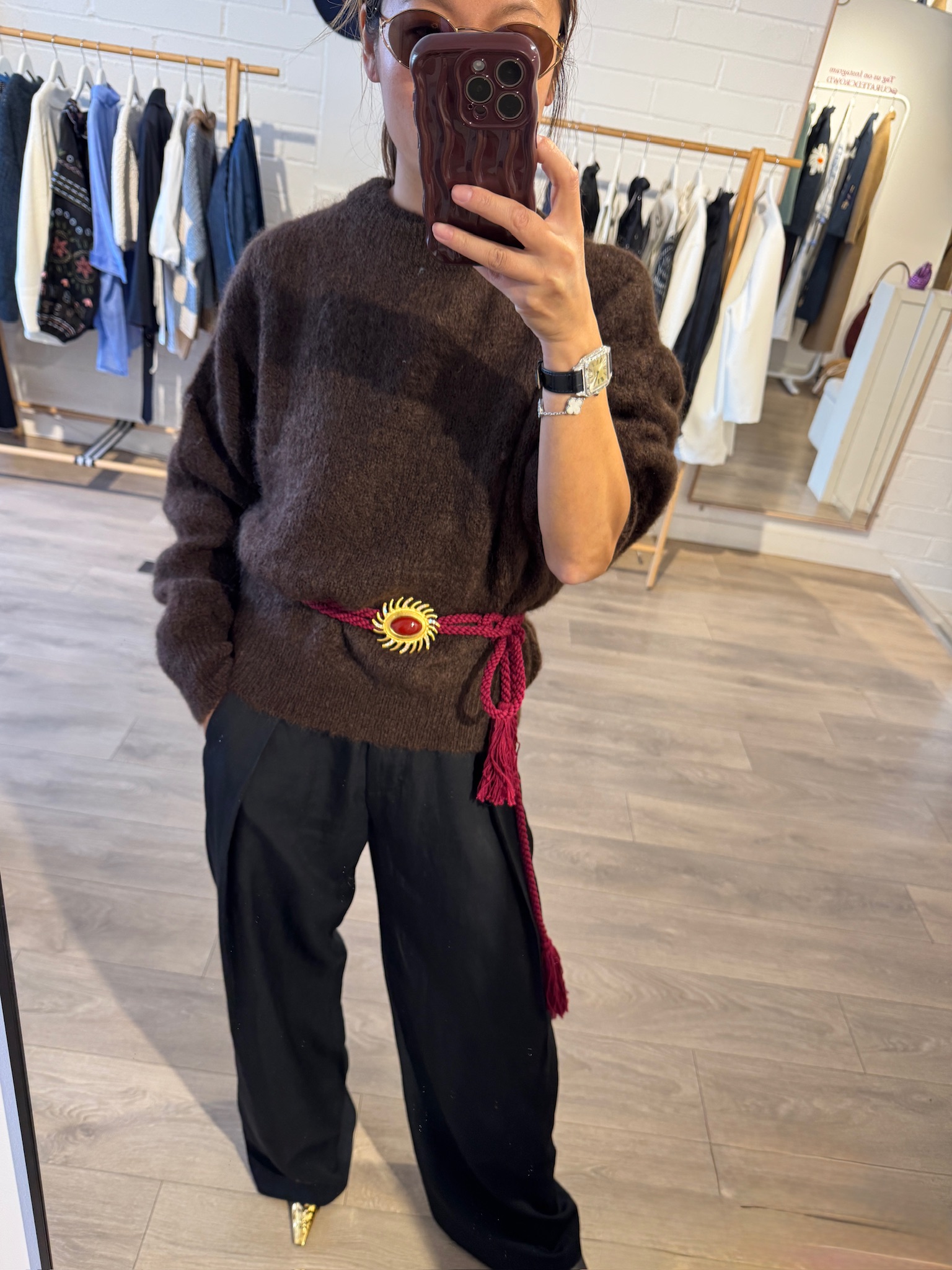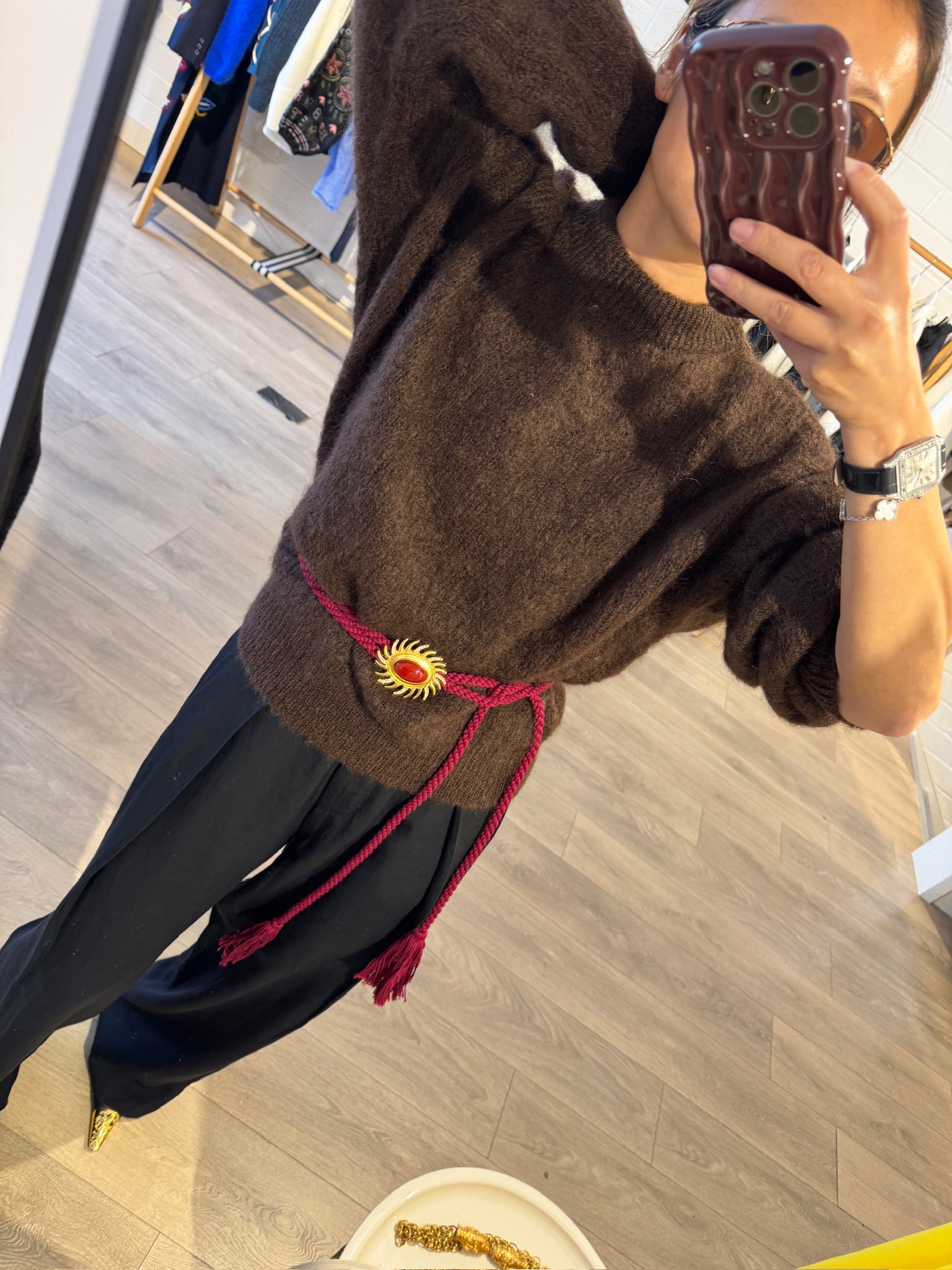 A vivid red twisted cotton cord anchors a radiant brass sun motif, beautifully enhanced with a 24 K gold overlay. At its centre, a simulated red carnelian cabochon catches the light, surrounded by stylised golden rays that celebrate warmth and vitality. Inspired by Sonia Petroff’s passion for ... Read more astrology and her Bulgarian heritage, the Sun Belt blends vintage boldness with celestial charm an enduring statement piece that brings brilliance to any ensemble.