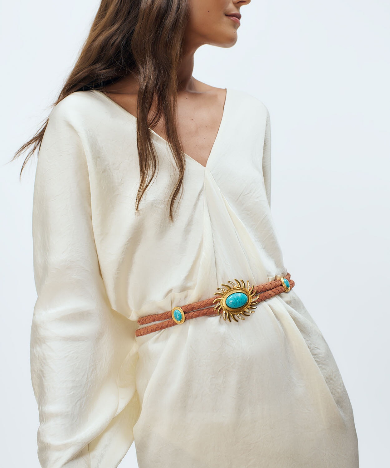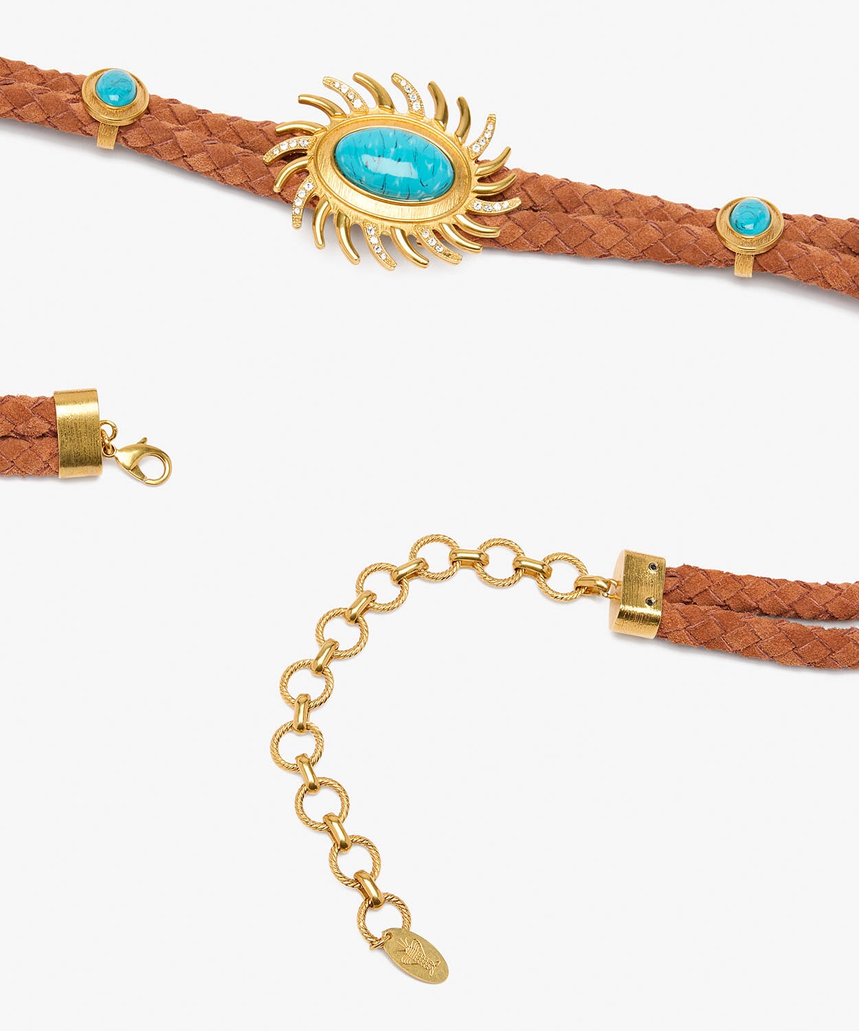 This Sun belt features braided pink suede, accented with brass embellishments, with a 24k gold overlay, framing a central sun motif and adorned with simulated turquoise cabochons ... Read more