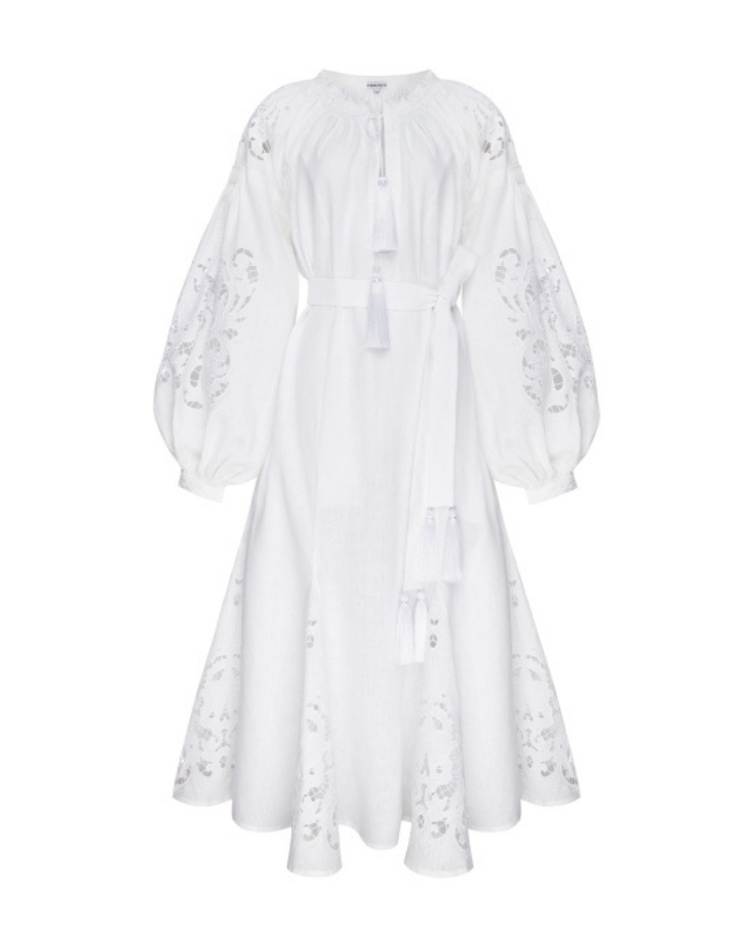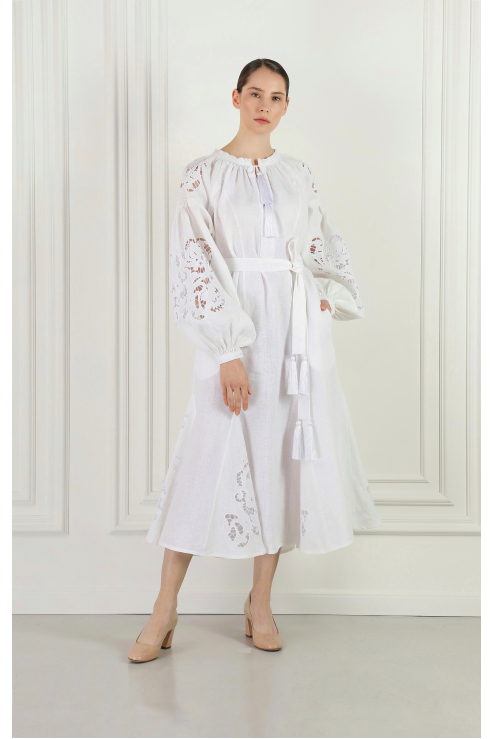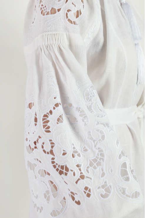 The dress is embroidered with author`s ornament in color of the fabric on the forearms, sleeves and neckline. Tassels are made of silk threads. The hem of the dress is decorated with embroidered wedges. Total white embroidery, feminine silhouette and handmade elements make this bohemian dress your ... Read more perfect outfit for a wedding or ceremonial event.