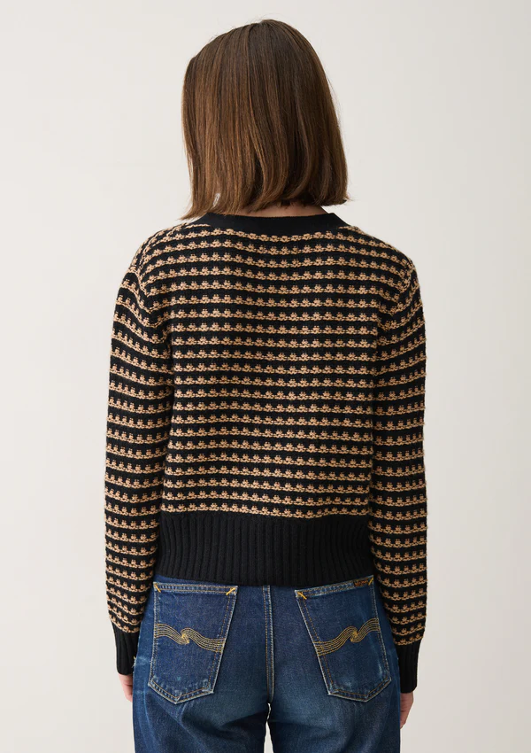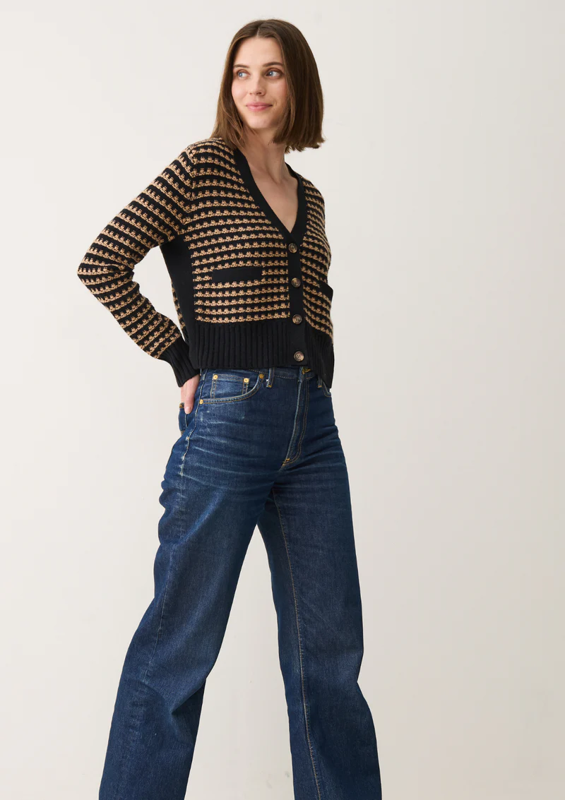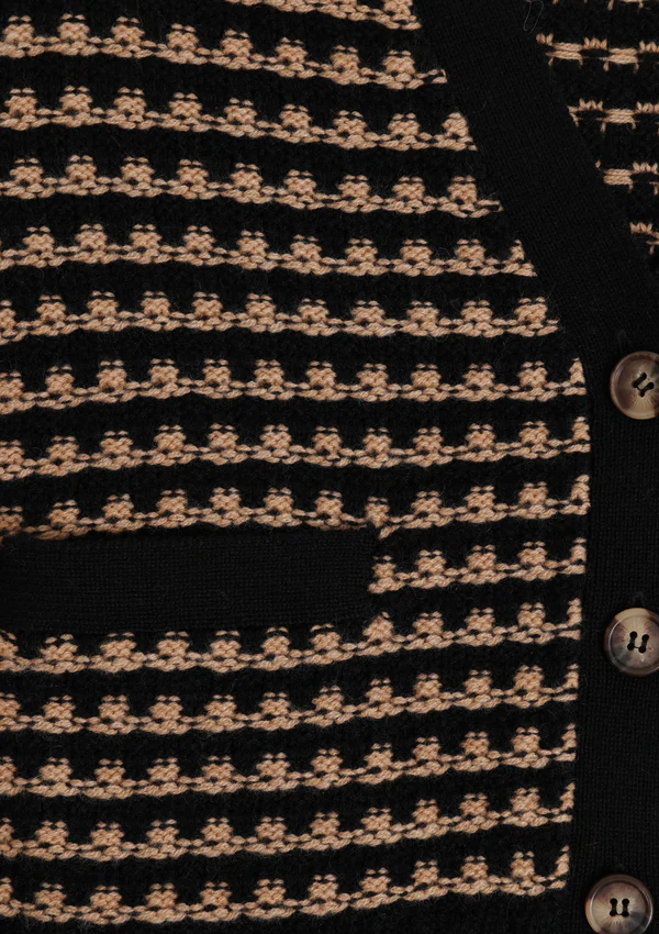 The Textured Cashmere Cardigan from Loop Cashmere is a chic and versatile piece perfect for any wardrobe. Featuring a black and beige pattern, this V-neck cardigan is crafted from premium cashmere, offering both comfort and luxury. The ribbed cuffs, hem, and button-down design add structure to its ... Read more relaxed fit, with two front pockets. Ideal for layering, this cardigan brings sophistication to both casual and polished looks.