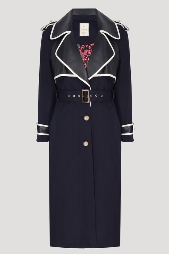The "Sunset Cascade Trench" in Navy colour is a high-fashion, tailored trench coat design with a bold colour scheme and unique structural details characterised by their sleek, sophisticated appearance. ... Read more