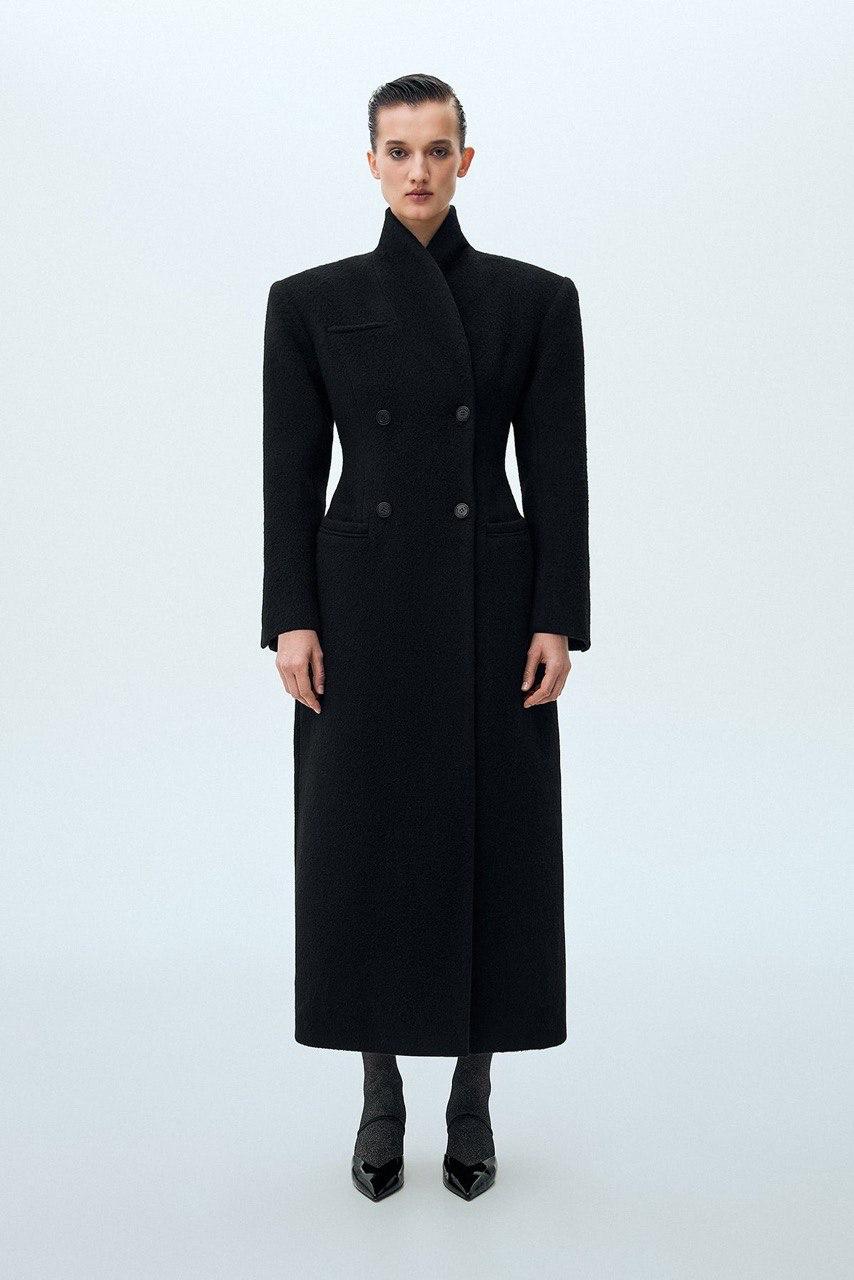 This hourglass shaped coat is a striking piece that embodies sophistication and modern tailoring. Crafted from a luxurious blend of 85% wool and 15% alpaca, it offers warmth, comfort, and a refined texture. Designed to withstand temperatures ranging from -1 to +10 degrees Celsius, it provides ... Read more the ideal balance of cosiness and breathability for cold weather. The coat features a structured, double-breasted front with a high collar.It comes in two sizes:- Size XS/S fits a UK 8-10, it corresponds to the girth of the chest and hip width of 85-100 cm- Size M/L fits a UK 10-12, it corresponds to the girth of the chest and hip width of 91 - 110 cm