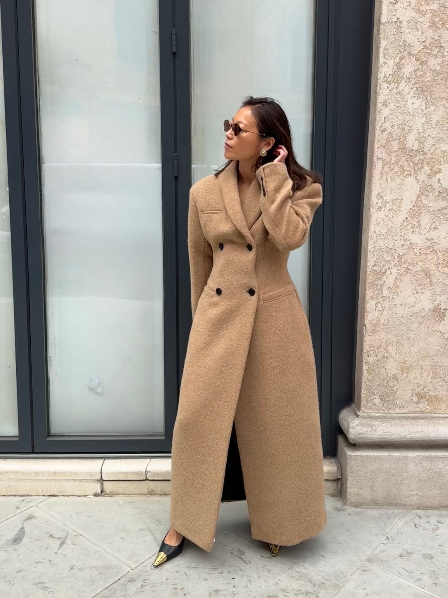 This hourglass shaped coat is a striking piece that embodies sophistication and modern tailoring. Crafted from a luxurious blend of 85% wool and 15% alpaca, it offers warmth, comfort, and a refined texture. Designed to withstand temperatures ranging from -1 to +10 degrees Celsius, it provides ... Read more the ideal balance of cosiness and breathability for cold weather. The coat features a structured, double-breasted front with a high collar.It comes in two sizes:- Size XS/S fits a UK 8-10, it corresponds to the girth of the chest and hip width of 85-100 cm- Size M/L fits a UK 10-12, it corresponds to the girth of the chest and hip width of 91 - 110 cm