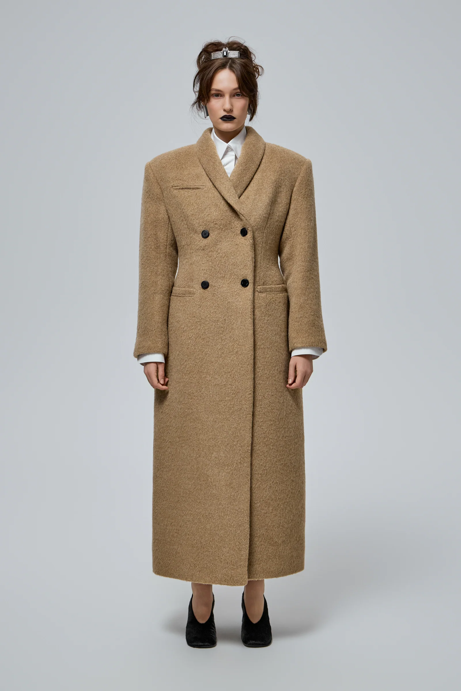 This hourglass shaped coat is a striking piece that embodies sophistication and modern tailoring. Crafted from a luxurious blend of 85% wool and 15% alpaca, it offers warmth, comfort, and a refined texture. Designed to withstand temperatures ranging from -1 to +10 degrees Celsius, it provides ... Read more the ideal balance of cosiness and breathability for cold weather. The coat features a structured, double-breasted front with a high collar.