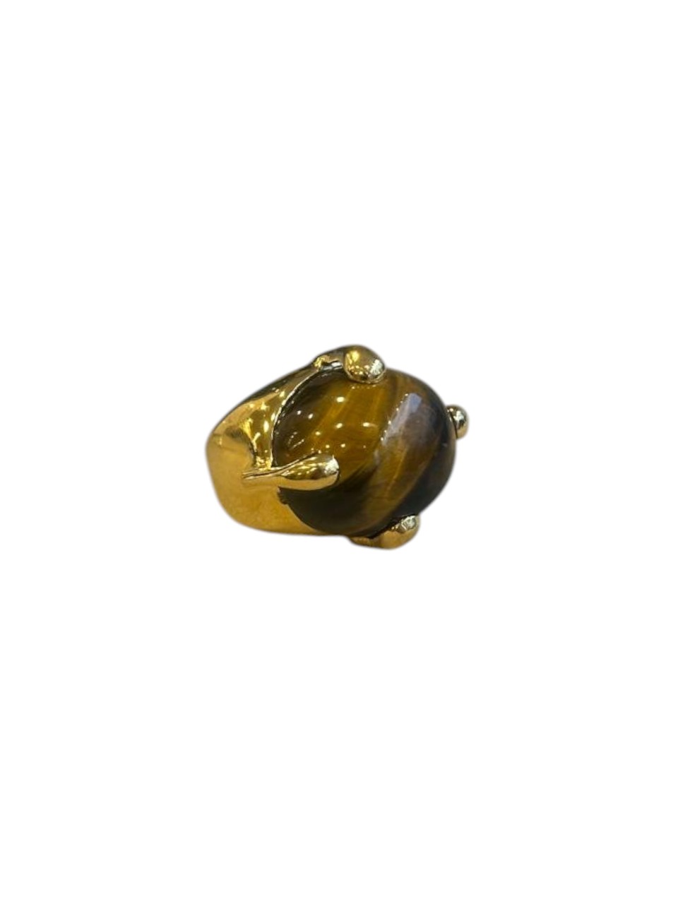 The Tiger Eye Set Chrissie Ring features a bold, polished Tiger Eye stone cradled in a sculptural gold-toned setting. Designed to highlight the stone’s deep, mirror-like shine, this statement ring blends modern strength with refined elegance, making it a striking piece for both day and evening wear. ... Read more