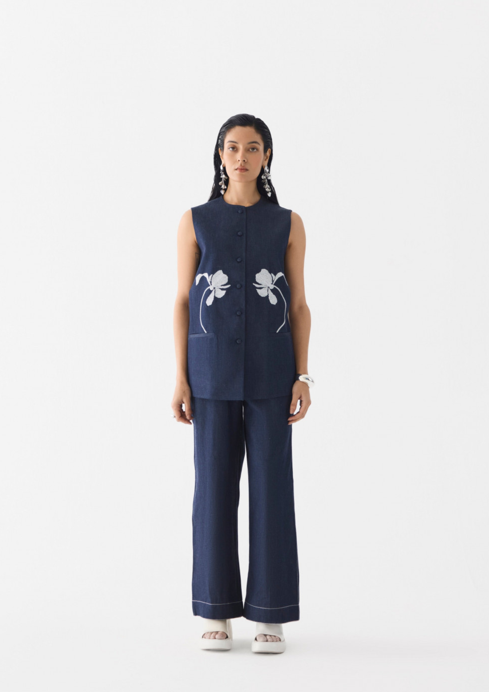 The Tiger Lily Denim Blazer & Trousers crafted from our stunning denim fabrication, trans-seasonal, is a statement piece. With a front opening, the blazer has white bead embroidery tiger lilies on each side. It has pockets and is lined. It is paired with our matching Calla Denim trousers with ... Read more topstitching. The pants have an elasticated back and pockets. Wear it with heels for an elegant look.