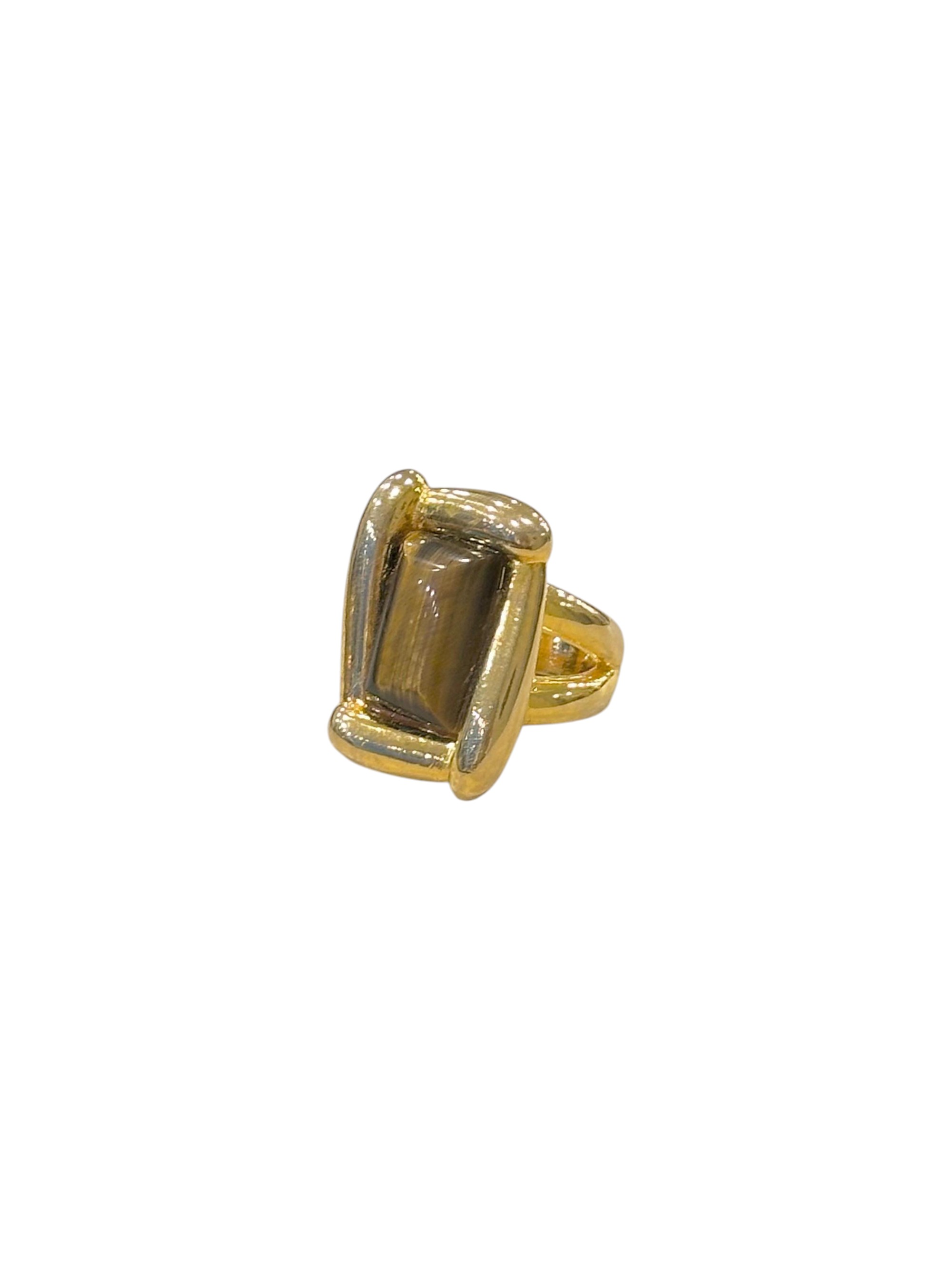 Elevate your everyday elegance with this striking Tiger’s Eye statement ring, crafted in a smooth, high-shine gold setting. Designed with a bold rectangular Tiger’s Eye stone, it features the gemstone’s signature golden-brown chatoyancy — a natural shimmer that catches the light with every movement. ... Read more The fluid, sculptural gold frame adds a modern yet timeless touch, making this piece perfect for both minimal daily styling and standout evening looks. A powerful stone known for confidence and protection, Tiger’s Eye brings meaning to its beauty, turning this ring into a piece that’s as empowering as it is effortlessly chic.