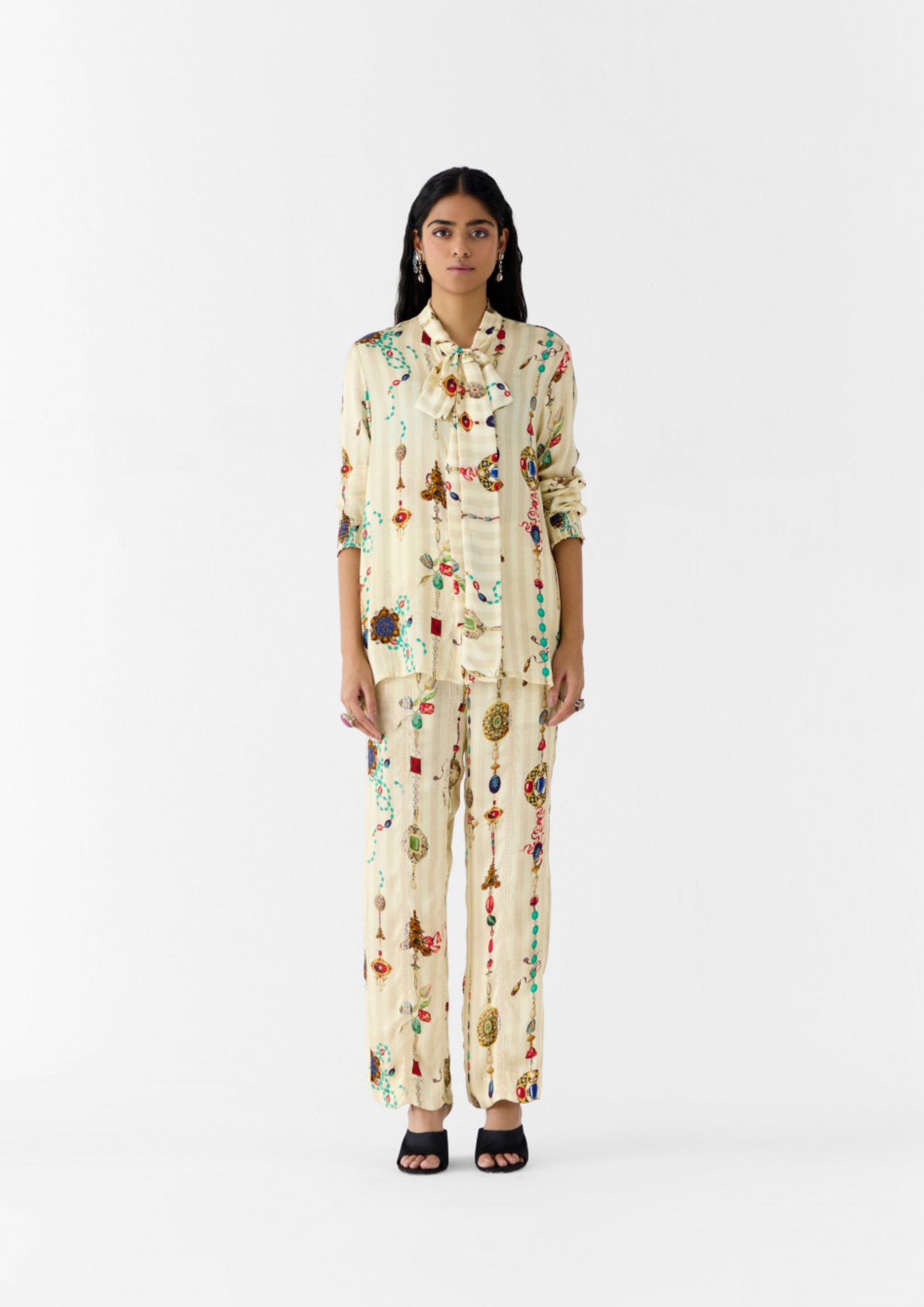 The Tijori Knot Shirt & Pants crafted from our stunning vegan silk fabrication, trans-seasonal, is a statement piece. This set, printed in our jewels tijori print, has a straight fit. With a knot at the neck, the shirt has ruching on the cuff and a front opening. It is paired with our matching ... Read more tijori trousers with an elasticated back. Wear it with heels for an elegant look.