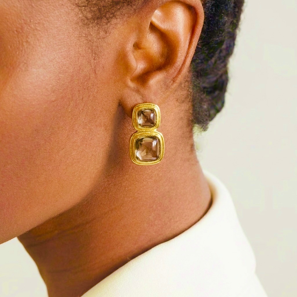 These two set Smokey Quartz Stone Stud Earrings showcase modern sophistication with a bold, structured design. Crafted with two stacked amazonite stones framed in polished gold, they create a clean geometric silhouette elevated by the natural shimmer of the stones. Perfect for making a statement ... Read more with minimal effort, this pair blends contemporary elegance with artisanal charm — a standout addition to any jewellery collection.