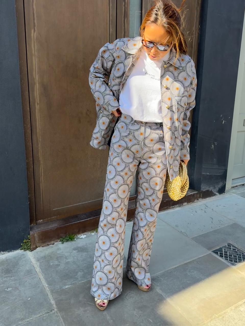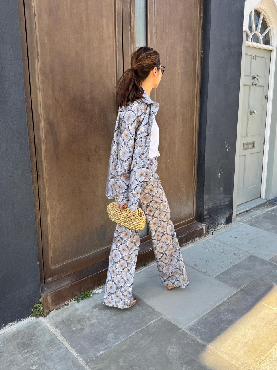 Crafted from consciously sourced cotton, the Unakite Pant boasts a high waist and a laid-back straight leg. Available in the Padme print in blue, it pairs perfectly with the Jade Jacket in the same print and the Hearts in a Row merino wool knits. Alenka wears hers with the Hearts in a Row ... Read more Cardigan in blue. Padme is a feminine name of Sanskrit origin, meaning "lotus flower." The Lotus of Life pattern in this collection was inspired from the painted ceiling of the Meenakshi Sundareswarar Temple in Madurai, South India, which depicts a stylized 1,000-petaled lotus flower—a symbol of elevated consciousness.