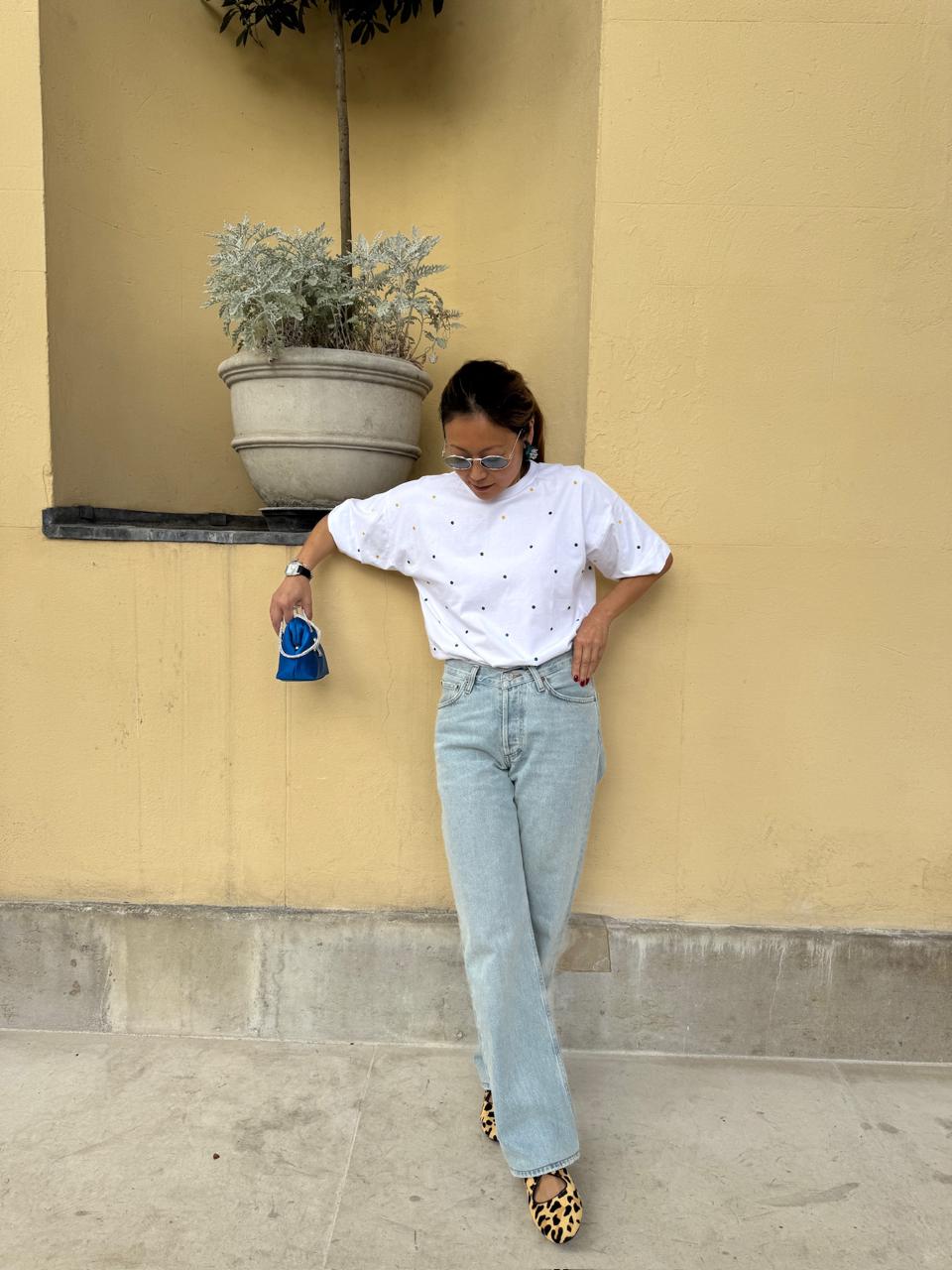 Introducing our hand-embroidered white polka dot T-shirt, crafted from 100% cotton for a soft and breathable feel. This unisex, oversized tee features half sleeves and showcases intricate blue, green, and yellow embroidery, adding a touch of artistry to your casual wardrobe. Available in sizes XS to ... Read more XXL, each piece is made to order and will be ready within 10 working days. For care, we recommend hand washing and ironing inside out at a low temperature.