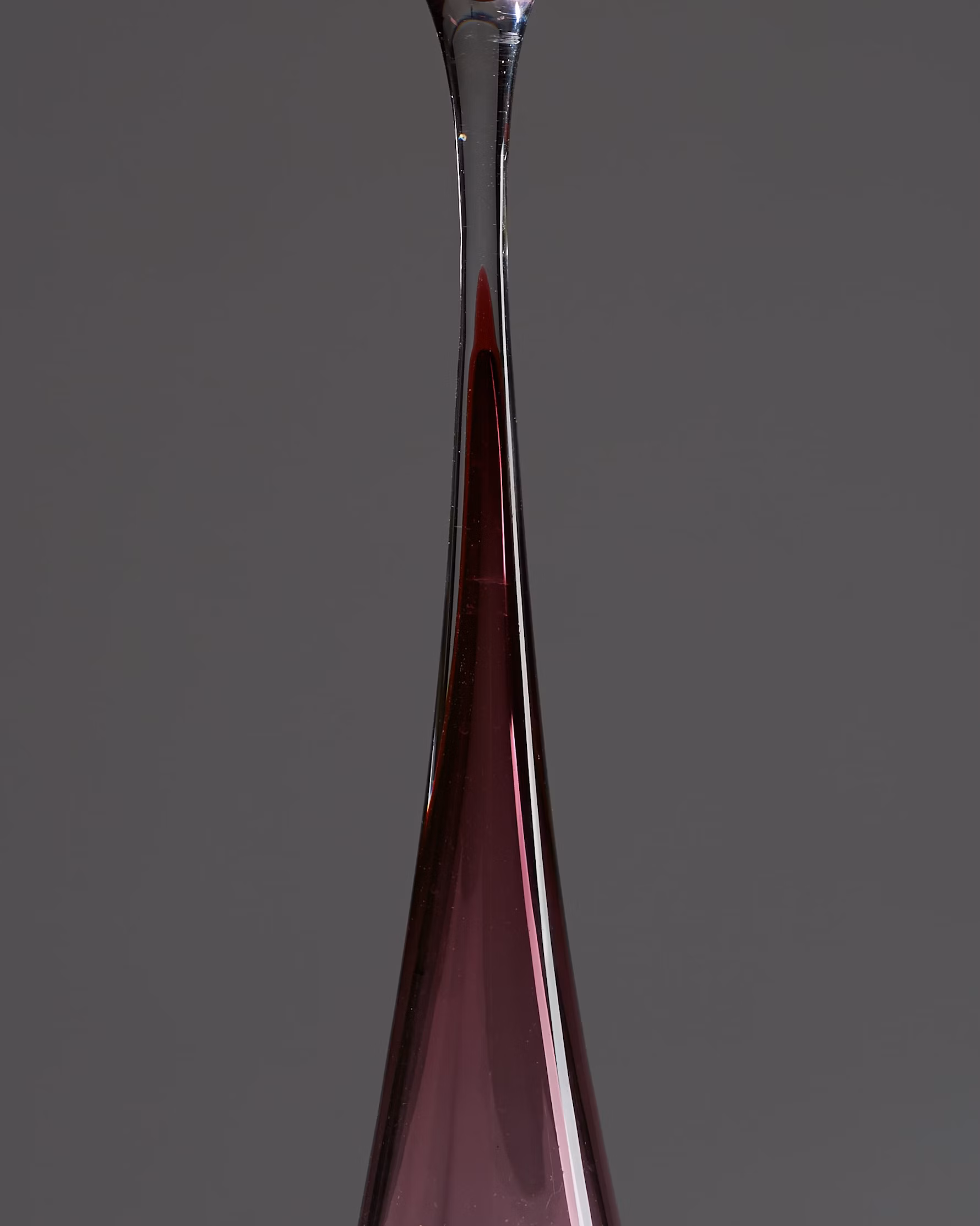 Vase 'Tulip' Designed by Nils Landberg for Orrefors, Sweden, 1950s This Tulip vase, designed by Nils Landberg for Orrefors in the 1950s, is a refined example of Scandinavian vintage design in art glass. Hand-blown in a delicate plum tone, the vase rises from a flared, almost liquid-looking base into ... Read more an impossibly slender stem that supports the elongated tulip-shaped body. The continuous silhouette and extreme lightness of the crystal demonstrate Landberg’s mastery of proportion and balance, qualities that have made his work a benchmark of Swedish modernism. Signed on the base, this Orrefors vase embodies the clarity and restraint that define mid century Scandinavian design. The softly tinted glass catches the light in subtle gradients, giving the piece both sculptural presence and a sense of quiet delicacy. Signed.