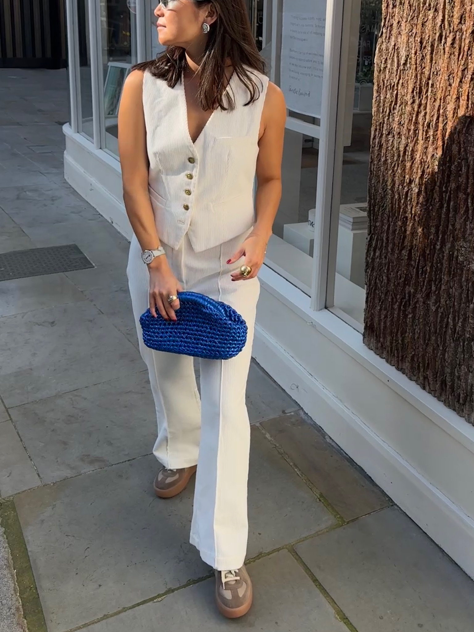 The Vida Corduroy Vest is a refined take on classic tailoring, crafted from premium corduroy fabric. Its structured silhouette features a flattering V-neckline and a row of elegant gold-tone buttons for a polished, timeless look. A single chest pocket and two front welt pockets add functional ... Read more sophistication, while the soft texture of the corduroy elevates its charm. Perfect for layering over blouses or pairing with matching corduroy trousers, this vest transitions effortlessly from day to evening, embodying modern elegance with a vintage-inspired touch.