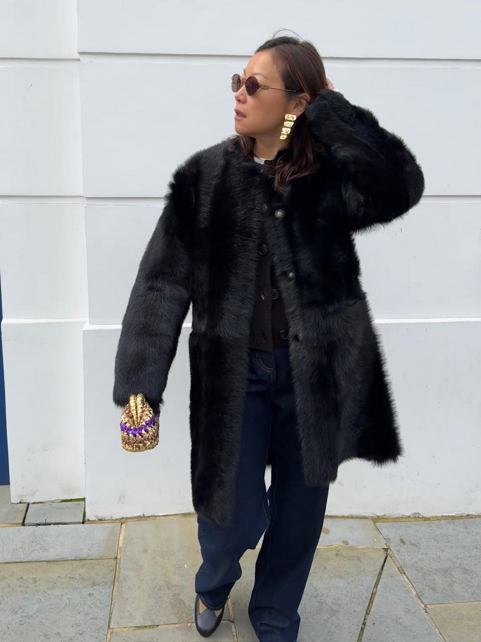 Elevate your cold-weather wardrobe with this luxurious black shearling coat. Crafted with a plush, soft-touch exterior and a smooth, structured silhouette, it offers exceptional warmth without compromising on style. The coat features classic button fastening, discreet side pockets, and a relaxed fit ... Read more that layers effortlessly over chunky knits or tailored pieces. Perfect for day-to-night wear, this statement outerwear adds an elegant finish to any ensemble, making it a modern essential for the season.
