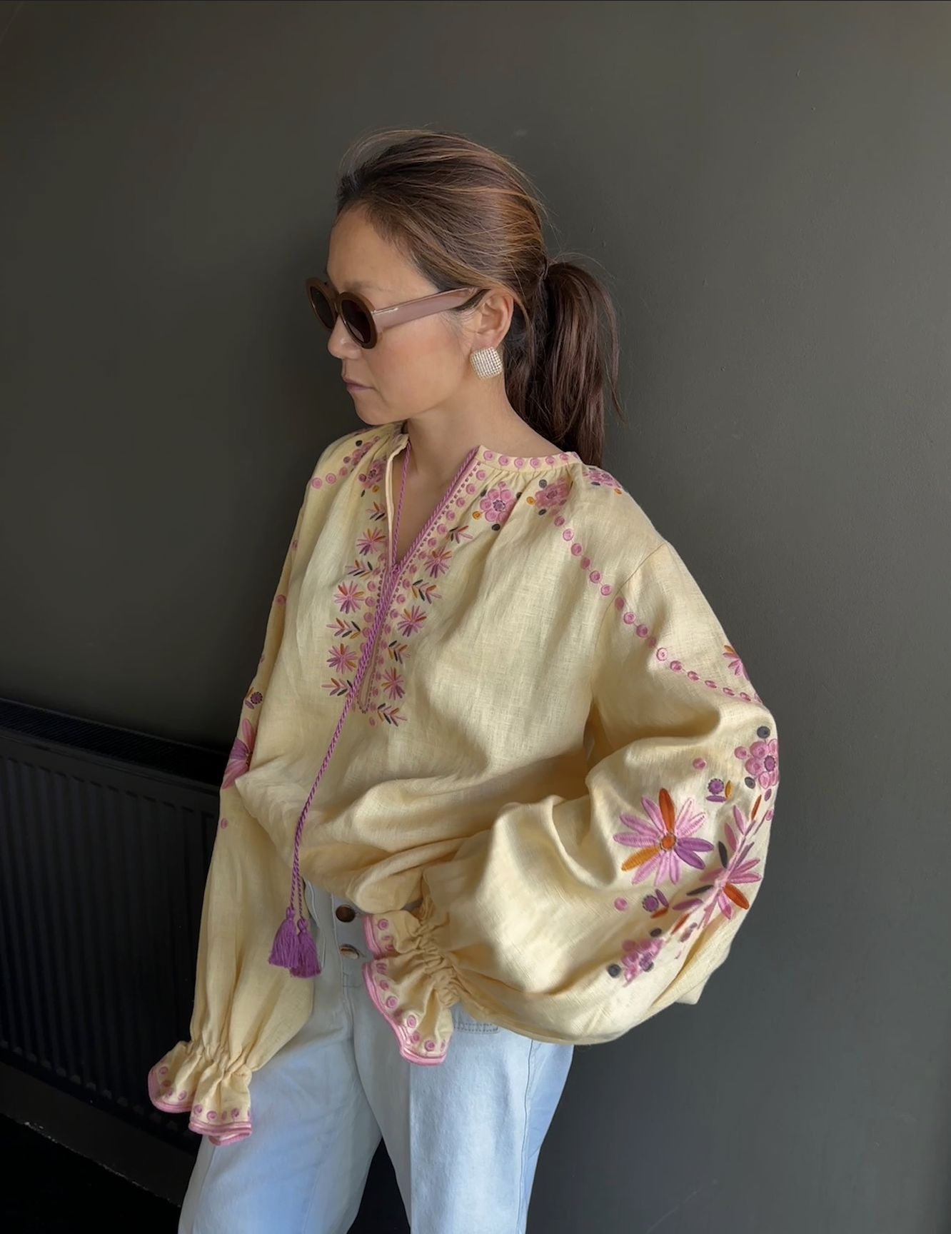 A poetic blend of tradition and modern elegance, the 'Kviten' blouse features a flowing, loose silhouette adorned with intricate floral embroidery. Designed with voluminous sleeves, the blouse offers a graceful drape, while the gathered elastic cuffs and flounce detail add a romantic touch. The ... Read more delicate stand collar enhances its refined aesthetic, making it a timeless piece that seamlessly transitions from day to night.