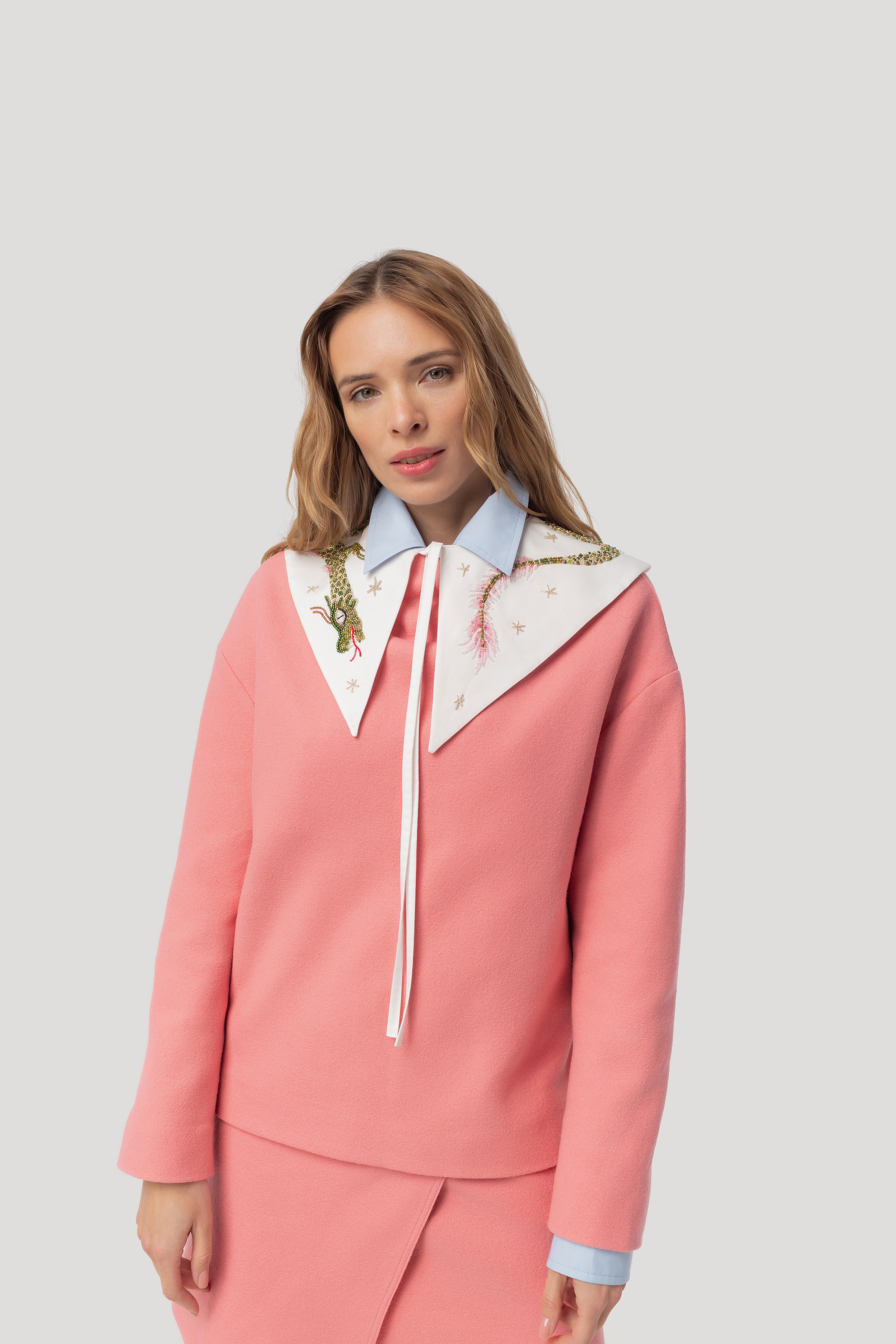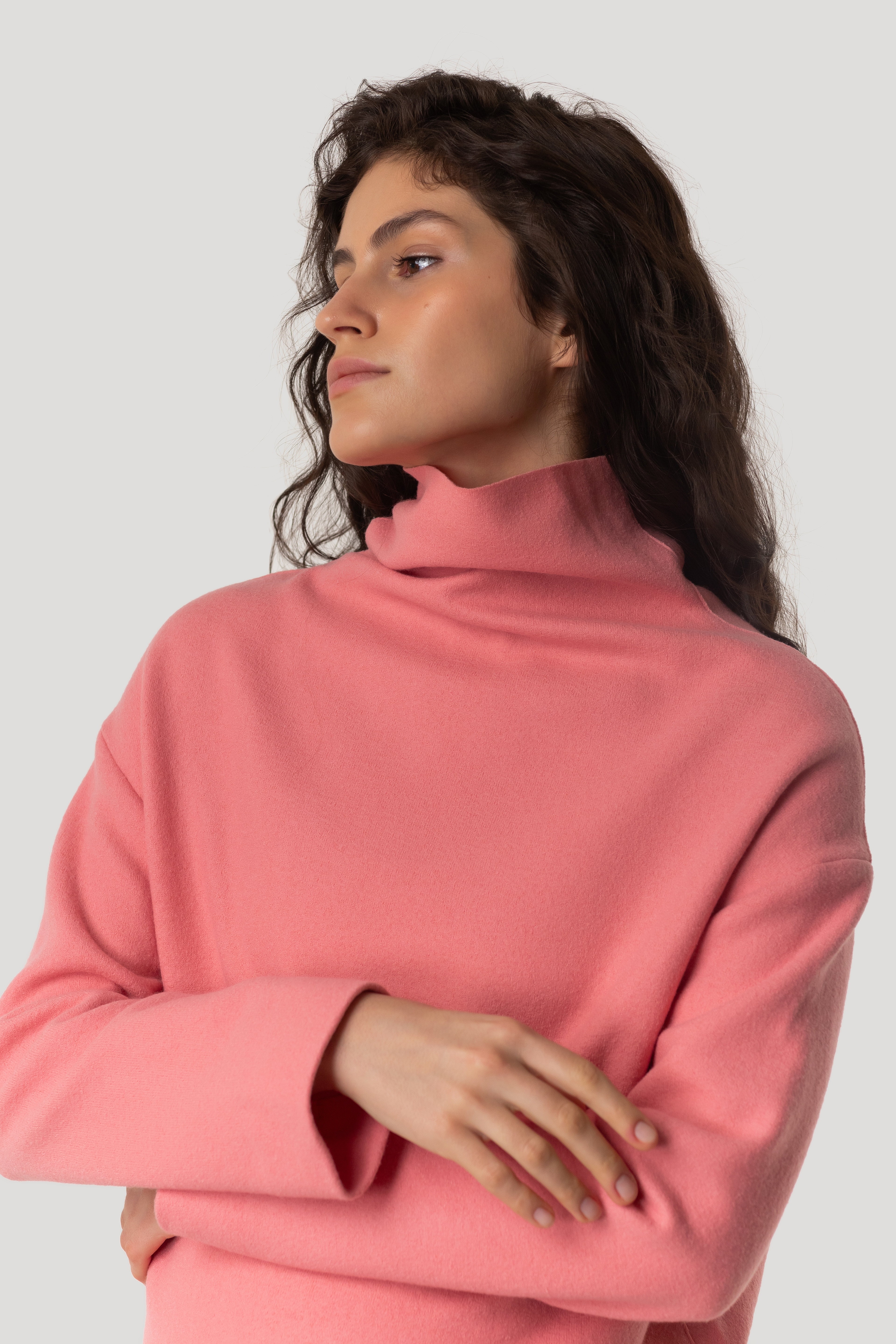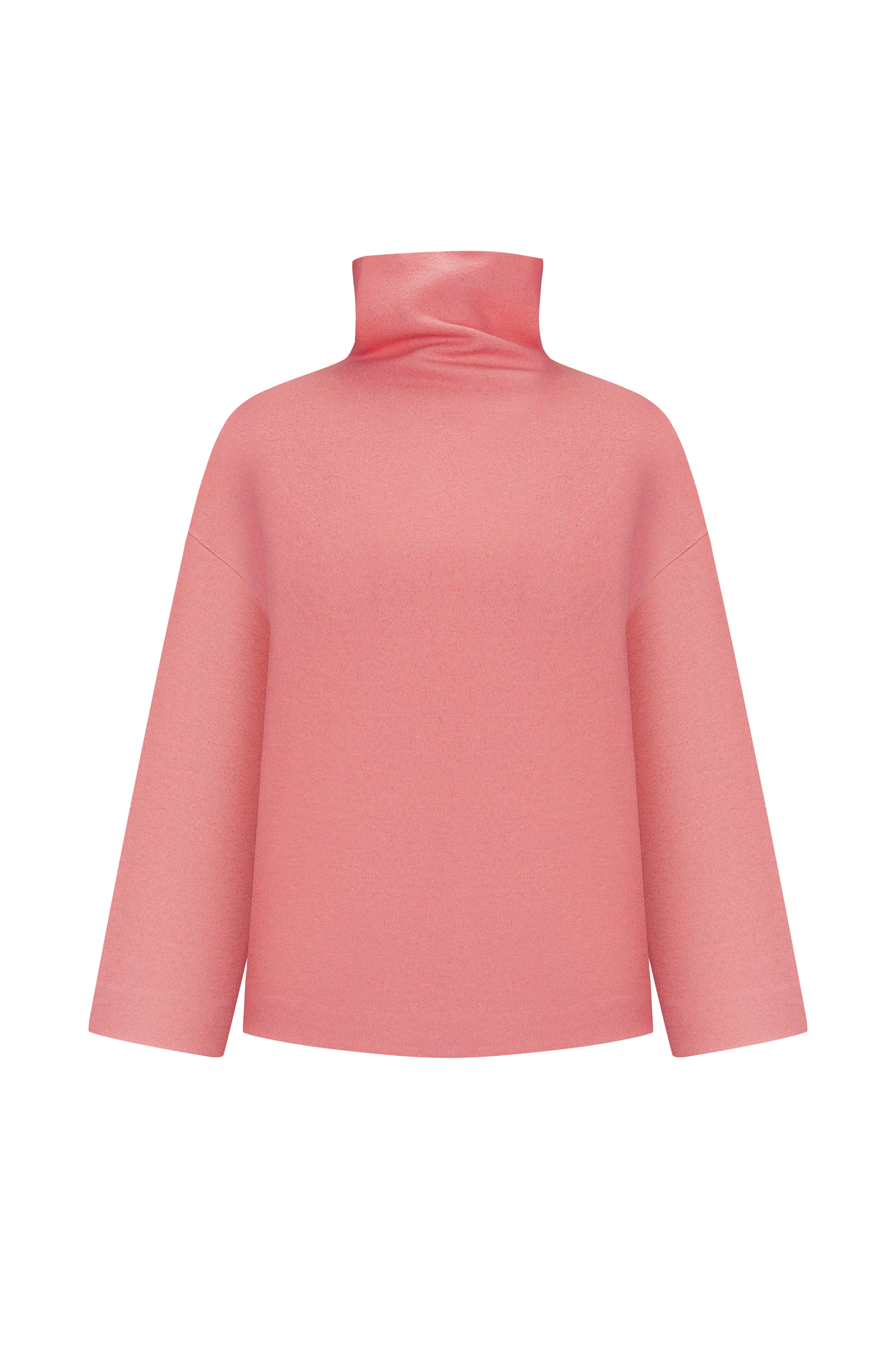 A powder-pink piece in its most refined form — this sweater features a high, wide neckline that drapes softly while holding its architectural line. Crafted from 100% virgin wool, the material feels exceptionally smooth and pure to the touch — naturally warm, breathable, and luxuriously soft against ... Read more the skin. The fabric has a subtle, natural stretch, allowing the silhouette to remain clean and structured while moving with the body. The relaxed shape meets a quietly polished attitude, creating a look that feels both effortless and meticulously considered. Its powder-pink tone reflects the natural blush on your cheek — a luminous, soft-focus shade that brings a gentle radiance to any outfit. For the best fit, we recommend choosing one size up. Collar not included.