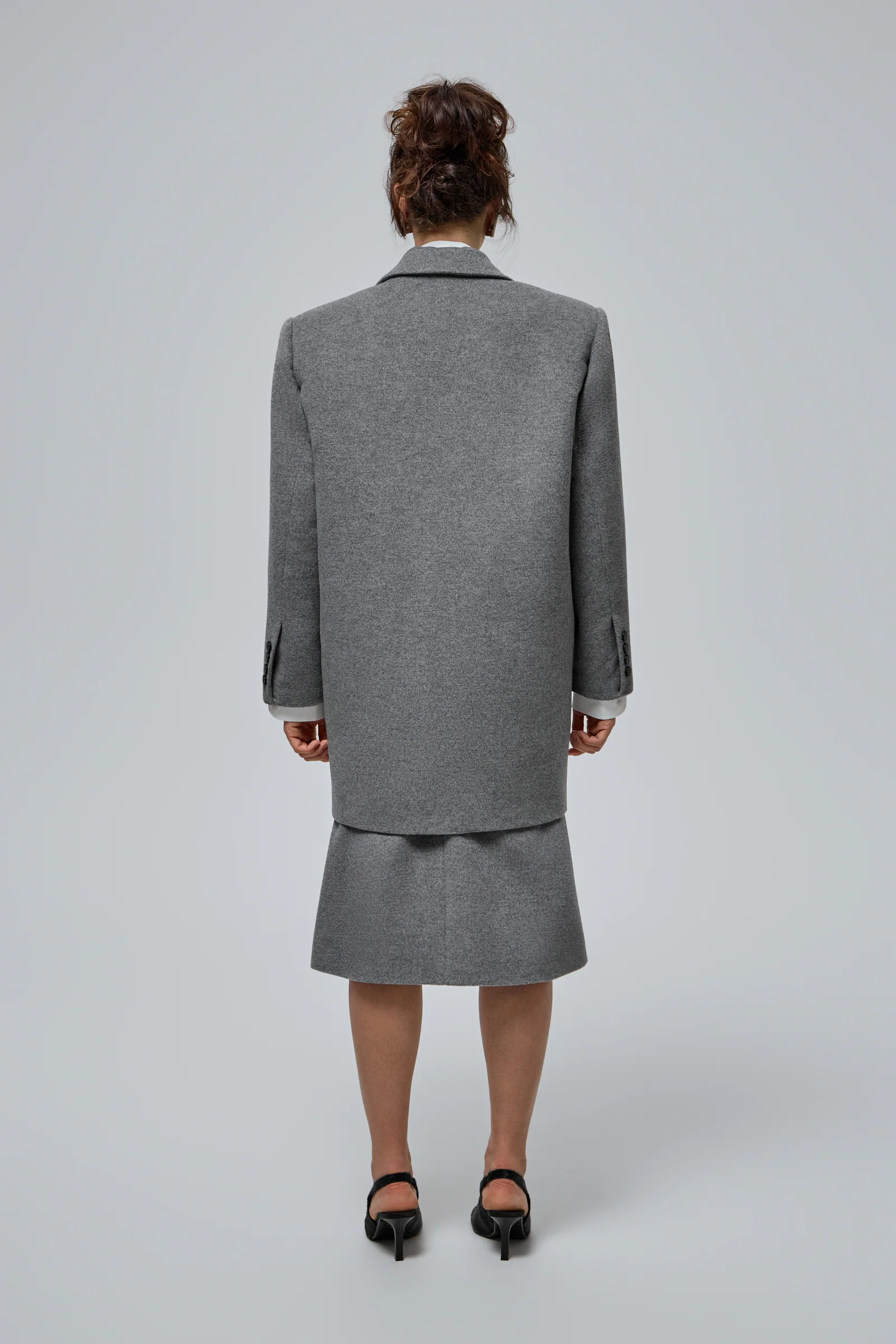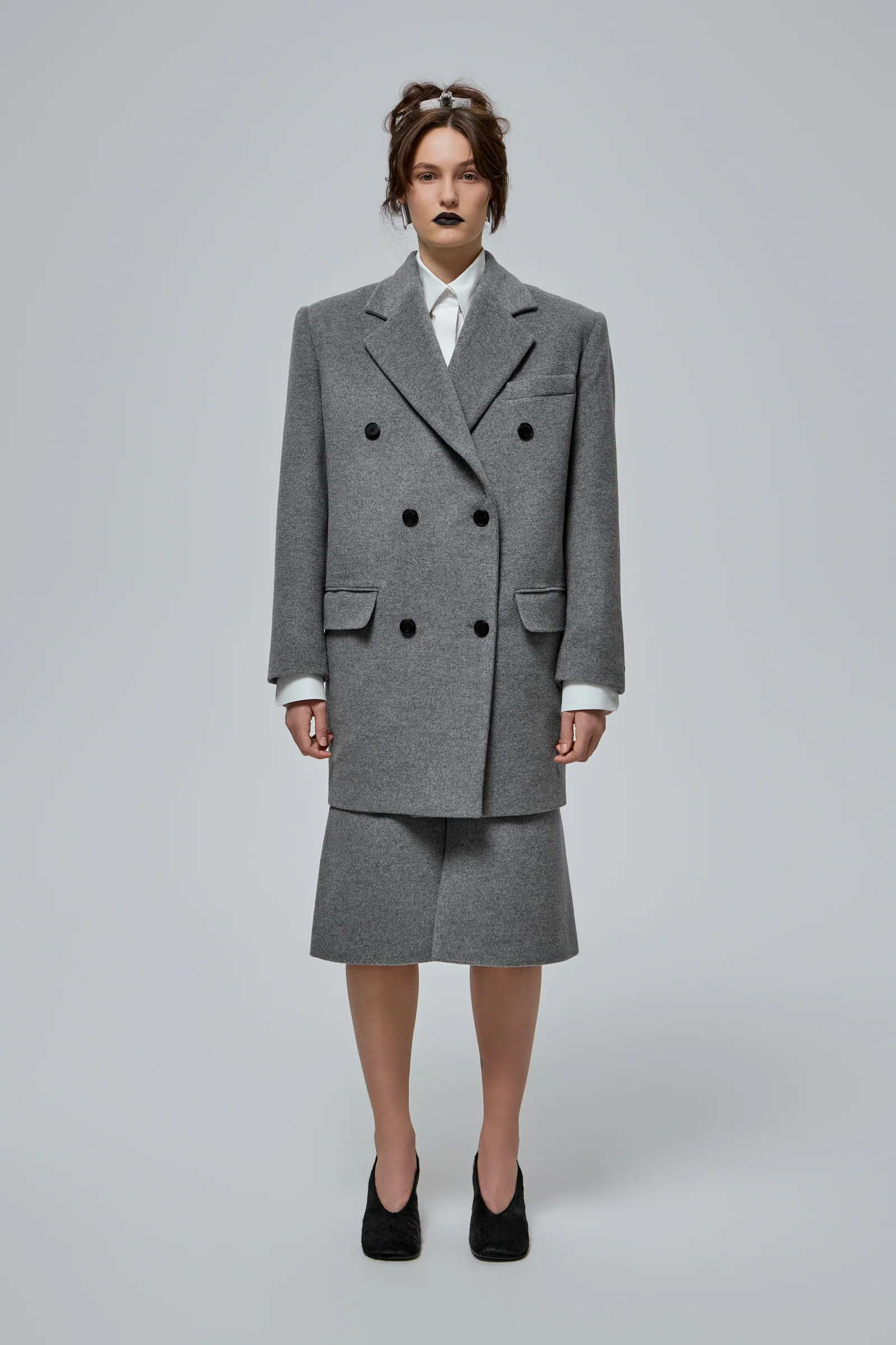 The YAPPI Jacket is a structured, double-breasted wool blazer designed with a clean, modern silhouette and an elevated minimalist appeal. Tailored in a rich grey tone, it features sharp lapels, strong shoulders, and a relaxed yet refined fit that adds effortless sophistication to any look. Finished ... Read more with classic black buttons, functional front pockets, and a smooth, polished drape, this jacket pairs perfectly with both tailored separates and casual layers—making it a timeless wardrobe essential for contemporary, confident style.
